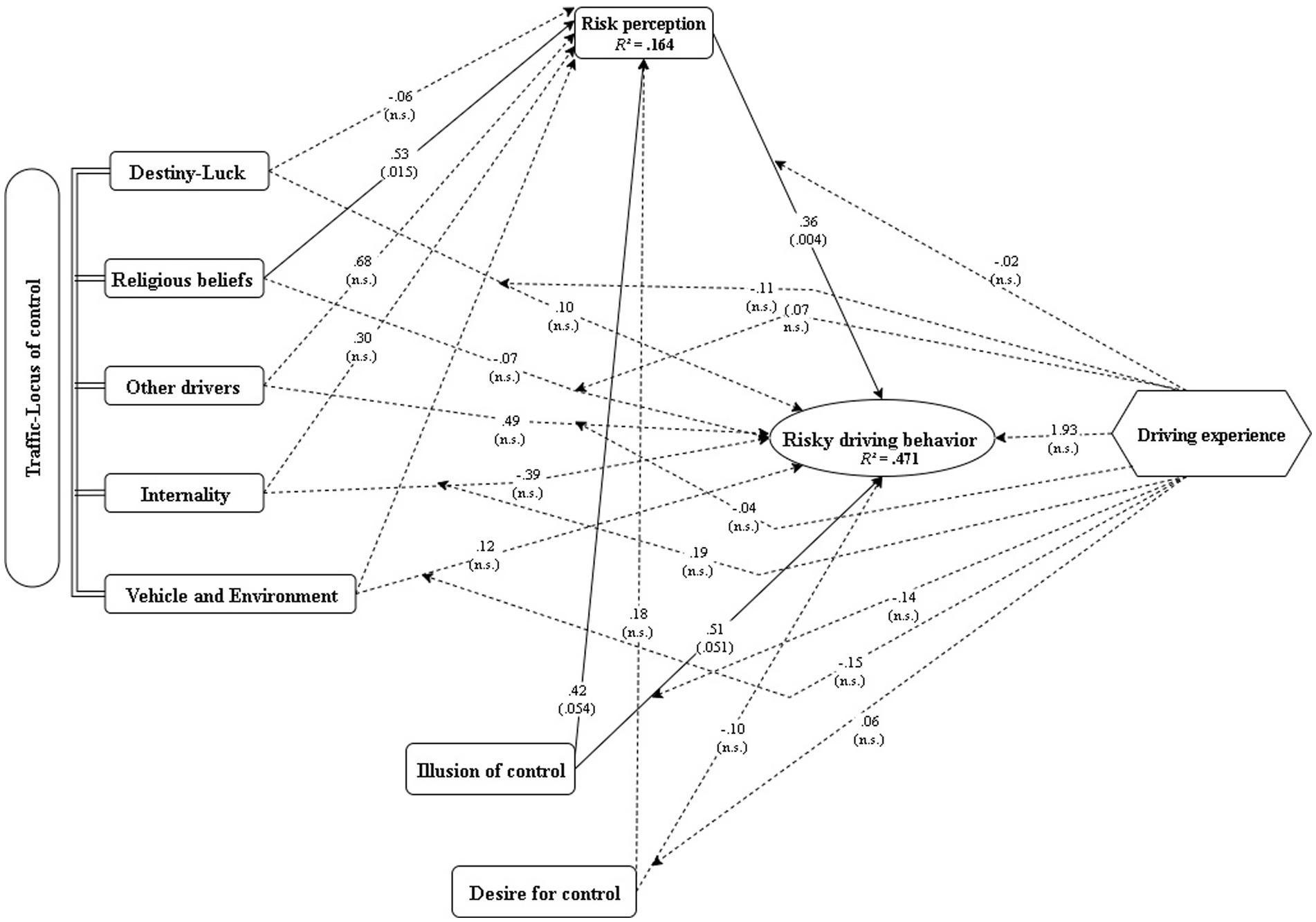 These results suggest that although psychological constructs such as illusion of control and religious attributions are associated with how drivers perceive risk, these perceptions may not translate into safer behavior. Furthermore, driving experience did not appear to buffer or amplify the influence of these variables. The mechanisms underlying risky driving remain complex and warrant further investigation using longitudinal or experimental approaches.