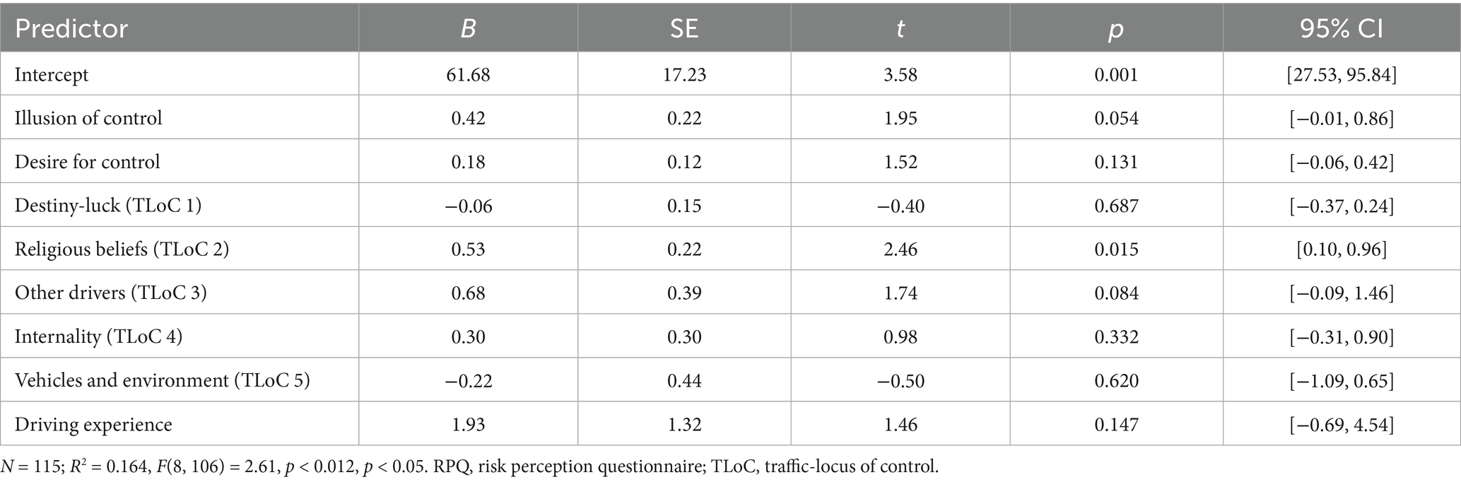 Among predictors, religious beliefs traffic-locus of control significantly predicted higher risk perception (B = 0.53, p = 0.015), while illusion of control showed a marginal effect (p = 0.054). Other predictors, including driving experience, were not significant predictors of RPQ (all p > 0.05). Complete coefficients are reported in Table 2.
