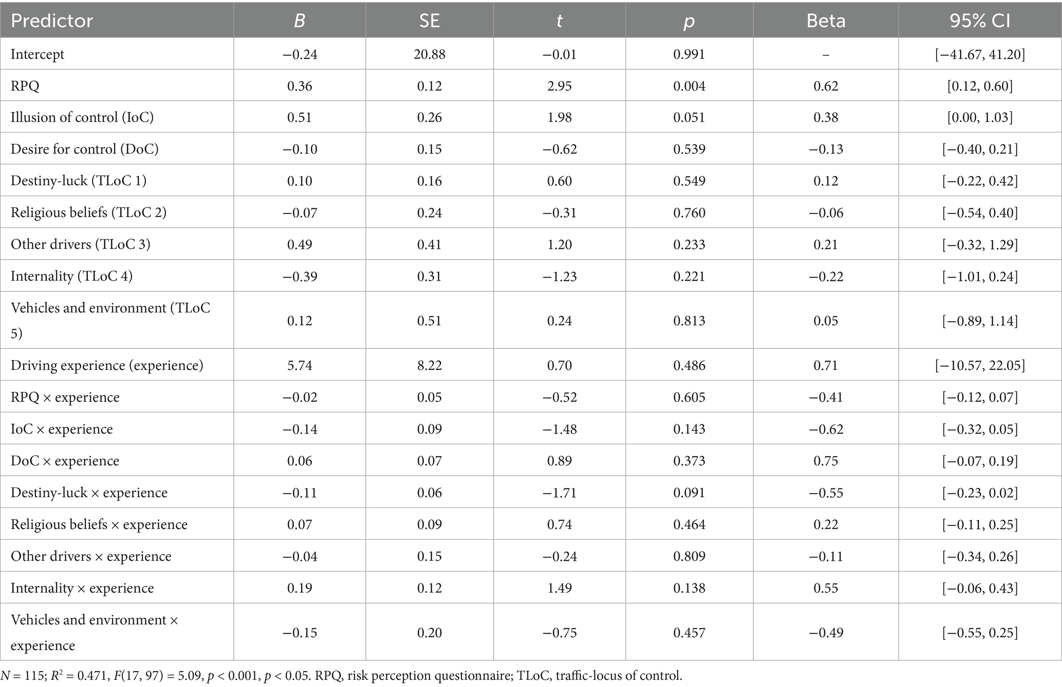 Significant predictors included: Risk perception (RPQ): B = 0.36, p = 0.004 (β = 0.62), indicating drivers who assess traffic situations as risky still engage in risky behaviors. Illusion of control showed a marginal effect: B = 0.51, p = 0.051.
