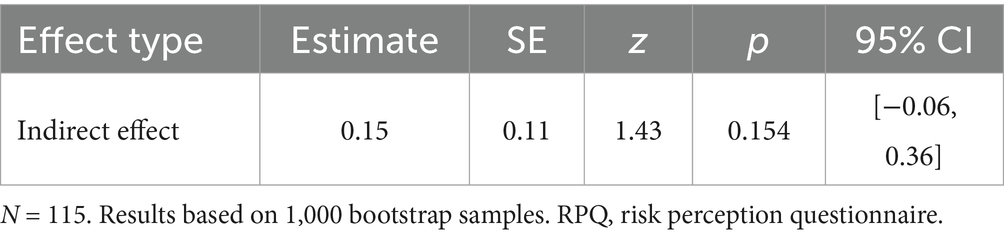 The indirect effect of illusion of control on risky driving behavior via RPQ was tested using bootstrapping (1,000 samples). The indirect effect was not significant (B = 0.15, SE = 0.11, z = 1.43, p = 0.154), indicating that risk perception did not significantly mediate this relationship in the combined model and confirming the stability of the original findings (see Table 4). Other indirect paths were not statistically tested or significant.
