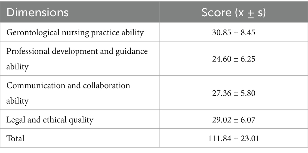 The results of this study show that the total score of gerontological nursing competence of 1777 vocational nursing students is (111.84 ± 23.01), which suggests that the overall gerontological nursing competence of students is at the upper-middle level, which is similar to the conclusion of Tohmola et al. (12). In this study, the dimension of gerontological nursing practice is (30.85 ± 8.45), professional development guidance is (24.60 ± 6.25), communication and cooperation is (27.36 ± 5.80), and legal ethics is (29.02 ± 6.07), which suggests that nursing students are more confident in gerontological nursing practice, communication and cooperation ability, legal and ethical quality, but weaker in professional development guidance ability. The dimension of professional development guidance in this study mainly includes the provision of professional nursing care, health counseling, individual life planning for older people or their families, as well as self-exploration of knowledge related to care, and a focus on nursing development and related topics. Analyzing the results of this study, the low scores in professional development guidance ability may be attributed to nursing students’ completion of gerontological nursing knowledge and assessment, yet their inability to effectively integrate theory and practice due to insufficient practical opportunities. Furthermore, the scores in communication and cooperative skills, as well as legal and ethical standards, are relatively elevated, potentially due to the absence of interactions with real patients and their families throughout class, leading to an optimistic attitude toward communication. A study by Ferretti-Rebustini et al. (15) once pointed out that gerontological nursing competence covers multiple dimensions, but in terms of levels, the most important competence may be practice competence, because the foundation of gerontological nursing depends on clinical competency, which can determine the need for action and follow-up through comprehensive assessment of patients’ problems, while combining clinical judgment and critical thinking to immediately recognize and appropriately manage common conditions in older people. Consequently, in gerontological nursing education, educators and clinical instructors should collaborate on developing strategies for integrating gerontological nursing content, addressing deficiencies in current curricula and practices to enhance nursing students’ competencies. During the instructional process, students may improve their competence in addressing real-world nursing problems through the combination of situational simulation training and case-based teaching, particularly in managing prevalent health issues among older people.