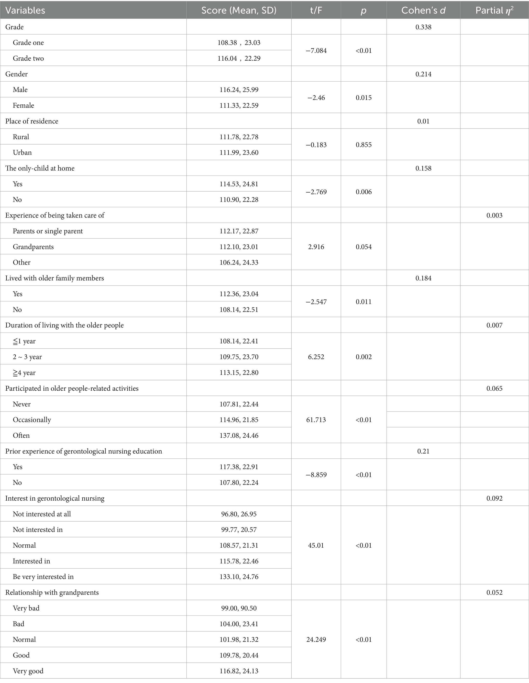 In our study, it was observed that gerontological nursing competence was significantly correlated with years of college and gender (p < 0.01, p = 0.015). It was also observed that second-year nursing students outperformed first-year students (p < 0.01). This is different from the findings of Alqahtani et al., who reported in their study that first-year students had better competence in caring for the older people (16), but similar to the findings of Cheng et al. (17). In the two study institutions, second-year nursing students have completed a specialized gerontological nursing module, which includes nearly 40 h of theoretical instruction and a two-week clinical internship, in contrast to first-year students. This type of curricular variation may contribute to the observation of higher scores among second-year students. The following studies should investigate how the various elements of gerontological nursing curricula influence students’ attitudes and competencies, including course length and clinical practice arrangements.