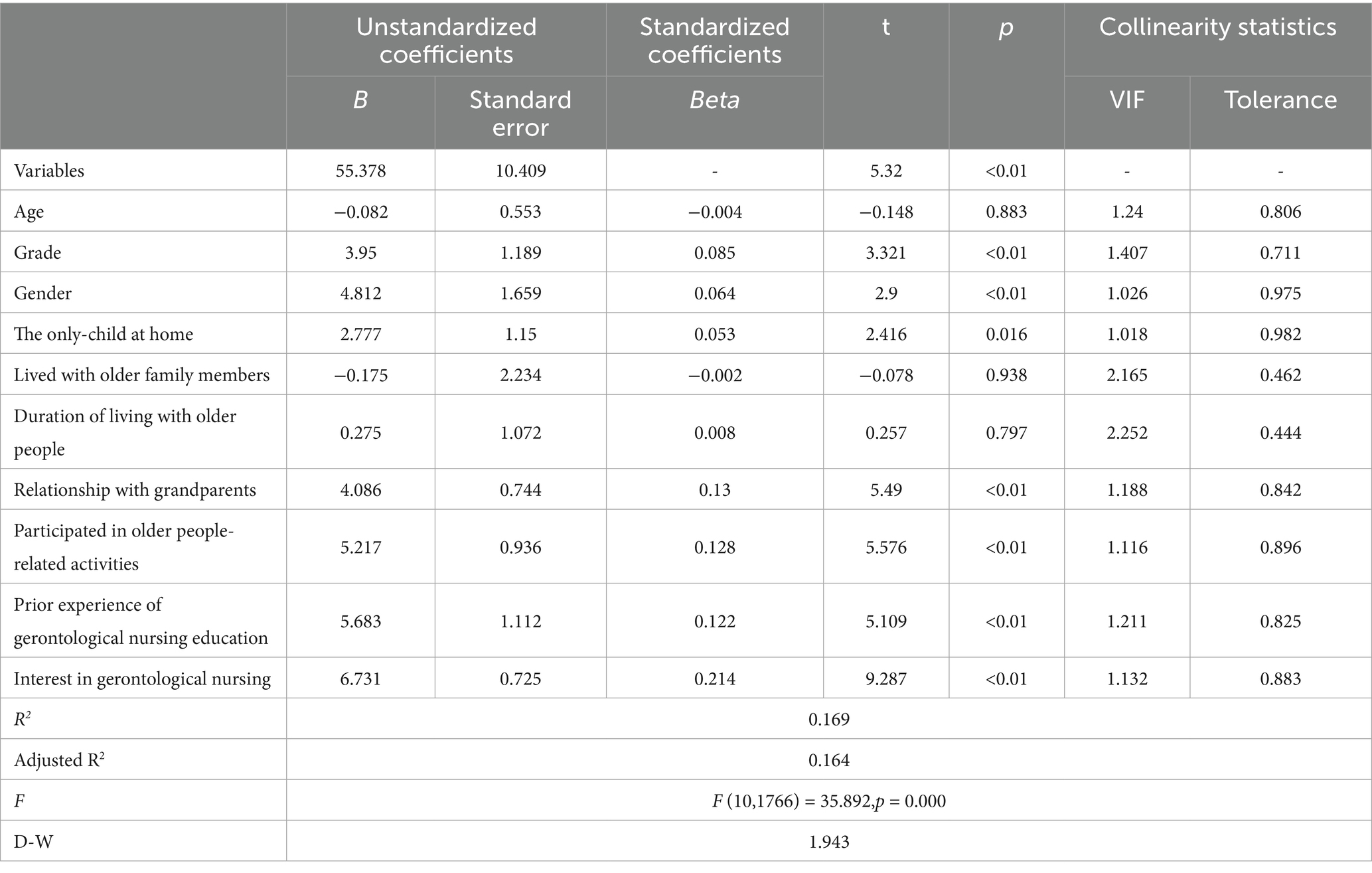 Multiple regression analysis of gerontological nursing competence in students see Table 4.
