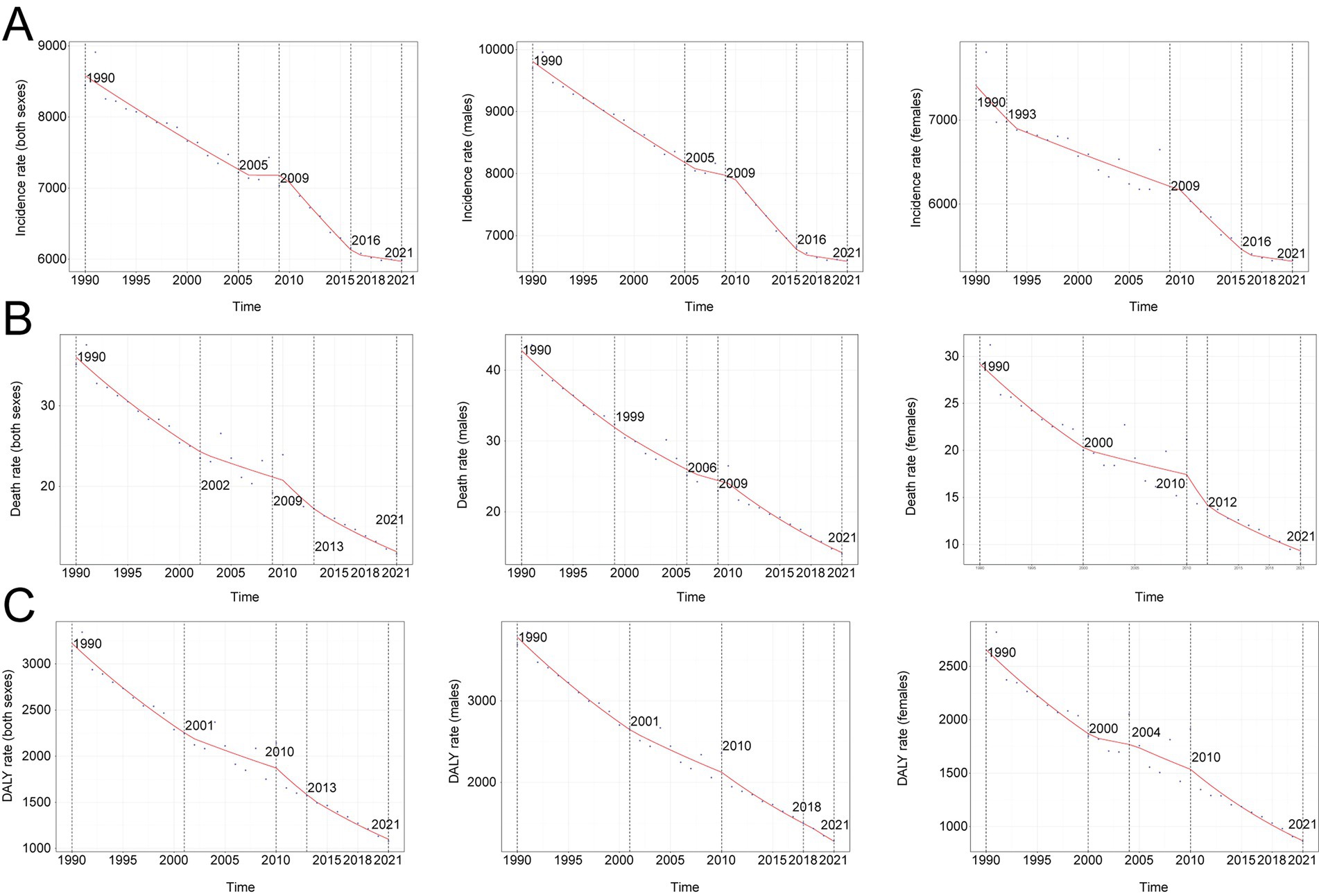 Figure 1. Annual percent change (APC) and trends in global unintentional injuries incidence, mortality, and disability-adjusted life years (DALYs) from 1990 to 2021. (A) Incidence rate. (B) Mortality rate. (C) DALYs rate.