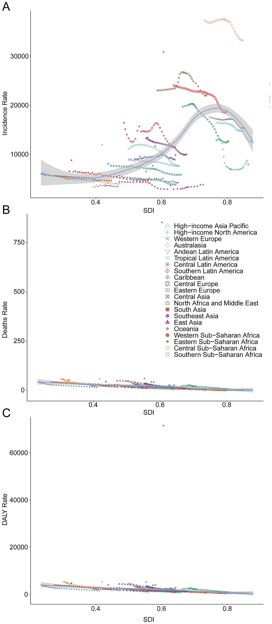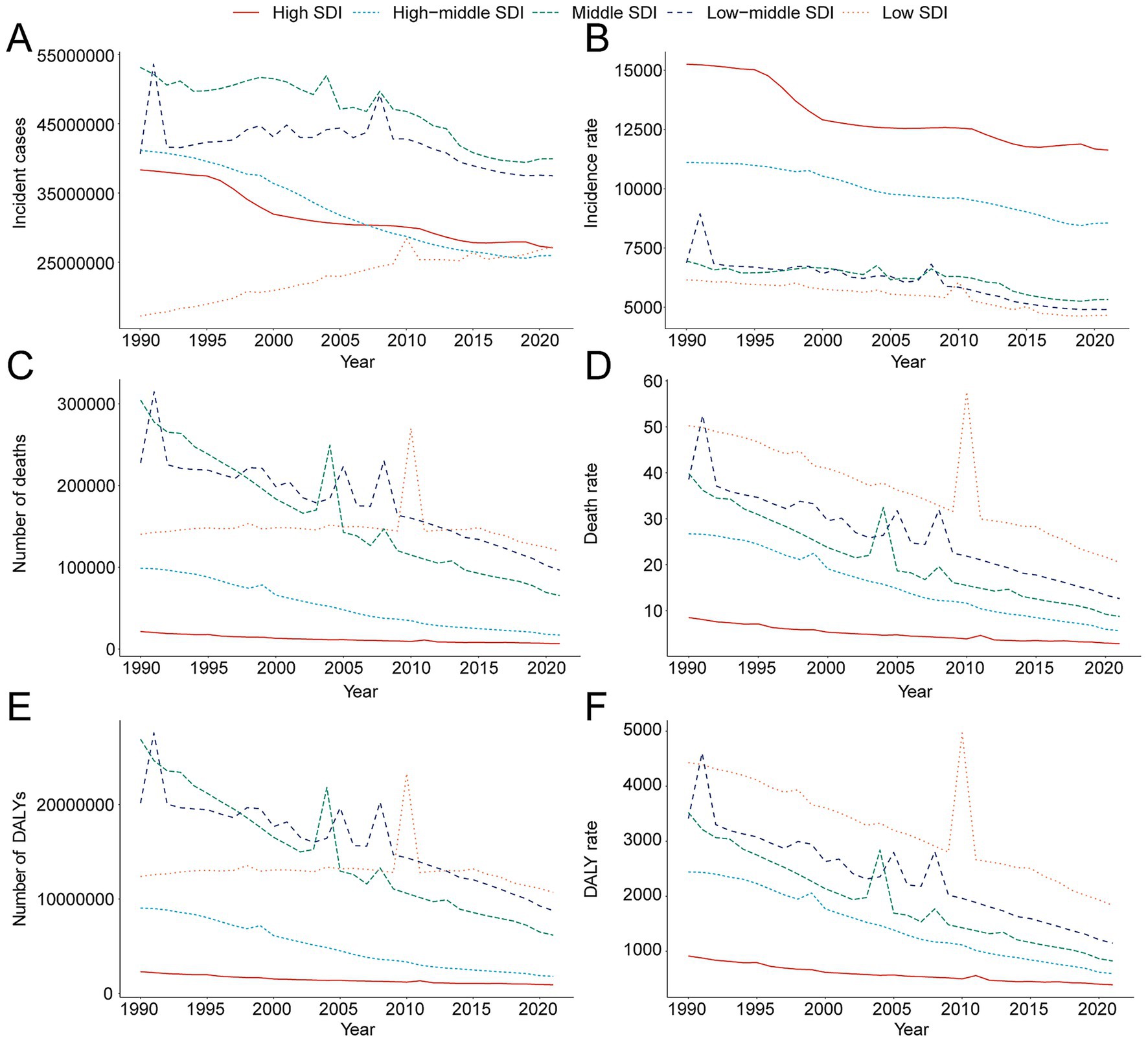 Between 1990 and 2021, incidence, mortality, and DALY rates fell across all SDI strata. In 2021, middle-SDI regions recorded the largest absolute numbers of cases (39,935,484.44; 95% UI 34,680,074.43–45,677,532.93), deaths (119,674.07; 95% UI 84,389.02–153,277.89), and DALYs (10,712,770.20; 95% UI 7,729,199.47–13,508,499.90) (Tables 1, 2, Supplementary Table S1). The greatest decline in incidence occurred in low-middle-SDI regions; high-middle-SDI regions showed the steepest mortality reduction, and middle-SDI regions the sharpest DALY decline (Figures 3A–F).