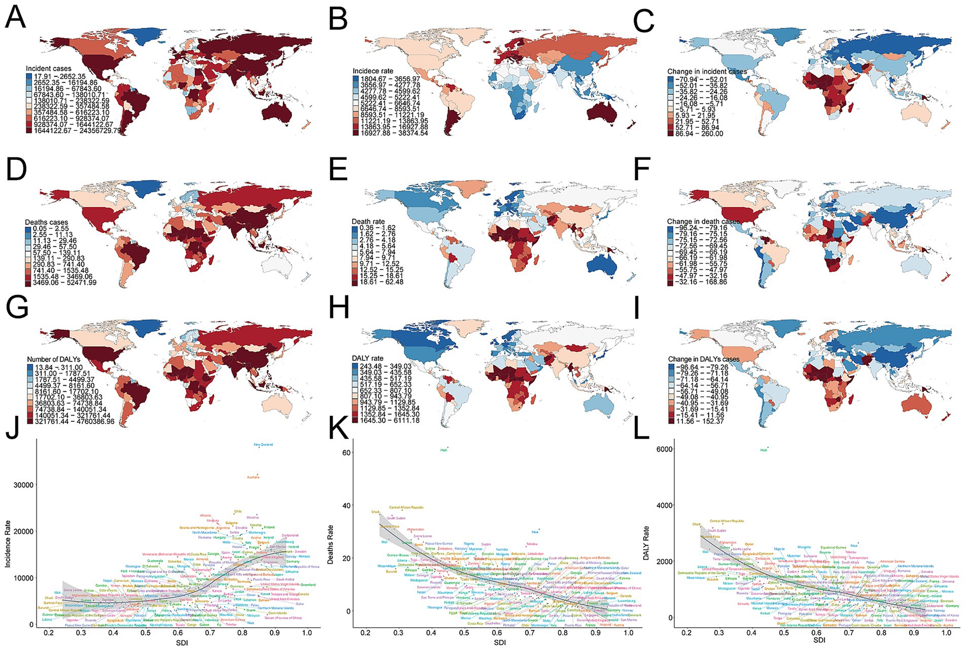 Figure 5. Incidence, death, and disability-adjusted life-years (DALYs) of unintentional injury across 204 countries and territories. (A) Incident cases. (B) Incidence rate. (C) Change in incident cases. (D) Death cases. (E) Death rate. (F) Change in death cases. (G) DALY cases. (H) DALY rate. (I) Change in DALY cases. (J) Trends in incidence rate. (K) Trends in death rate. (L) Trends in DALY rate.