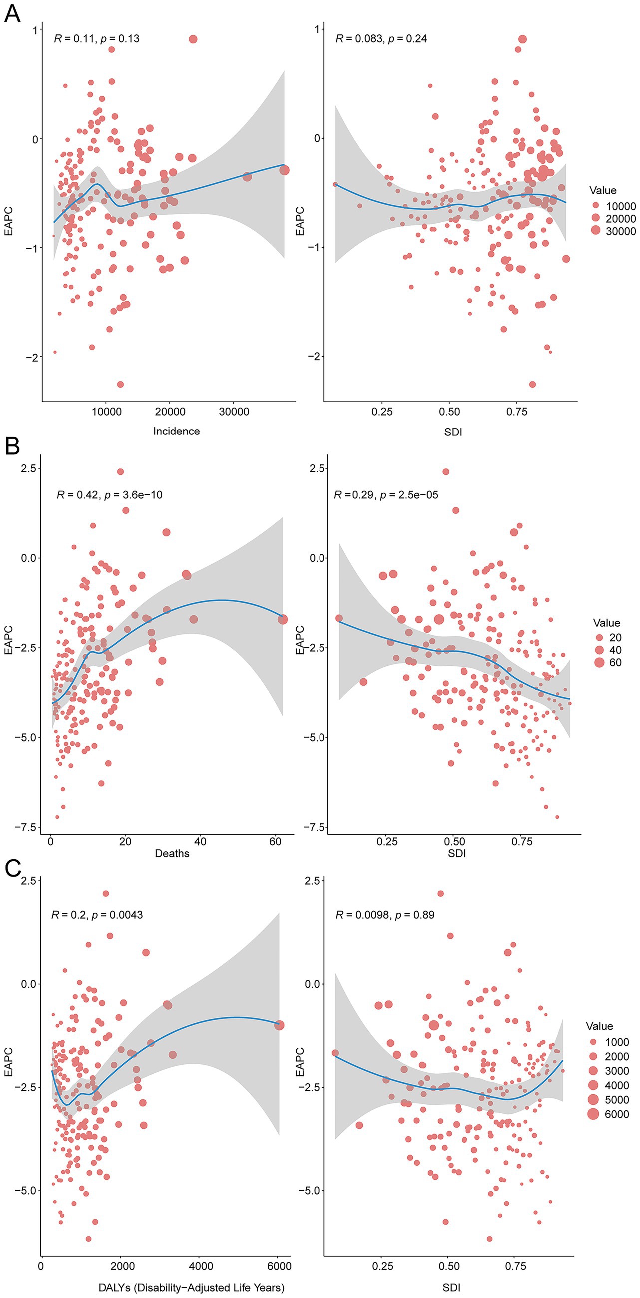 Across 204 countries and territories, the EAPC in incidence displayed no significant linear relation with baseline case numbers (R = 0.11, p = 0.13) or with the Socio-demographic Index (SDI; R = −0.083, p = 0.24) (Figure 6A). By contrast, the EAPC in mortality correlated positively with baseline deaths (R = 0.42, p = 3.6 × 10−10) and inversely with SDI (R = −0.29, p = 2.5 × 10−5) (Figure 6B). For DALYs, a modest positive correlation emerged with baseline DALYs (R = 0.20, p = 0.0043). In contrast, the association with SDI was negligible (R = 0.0098, p = 0.89) (Figure 6C).