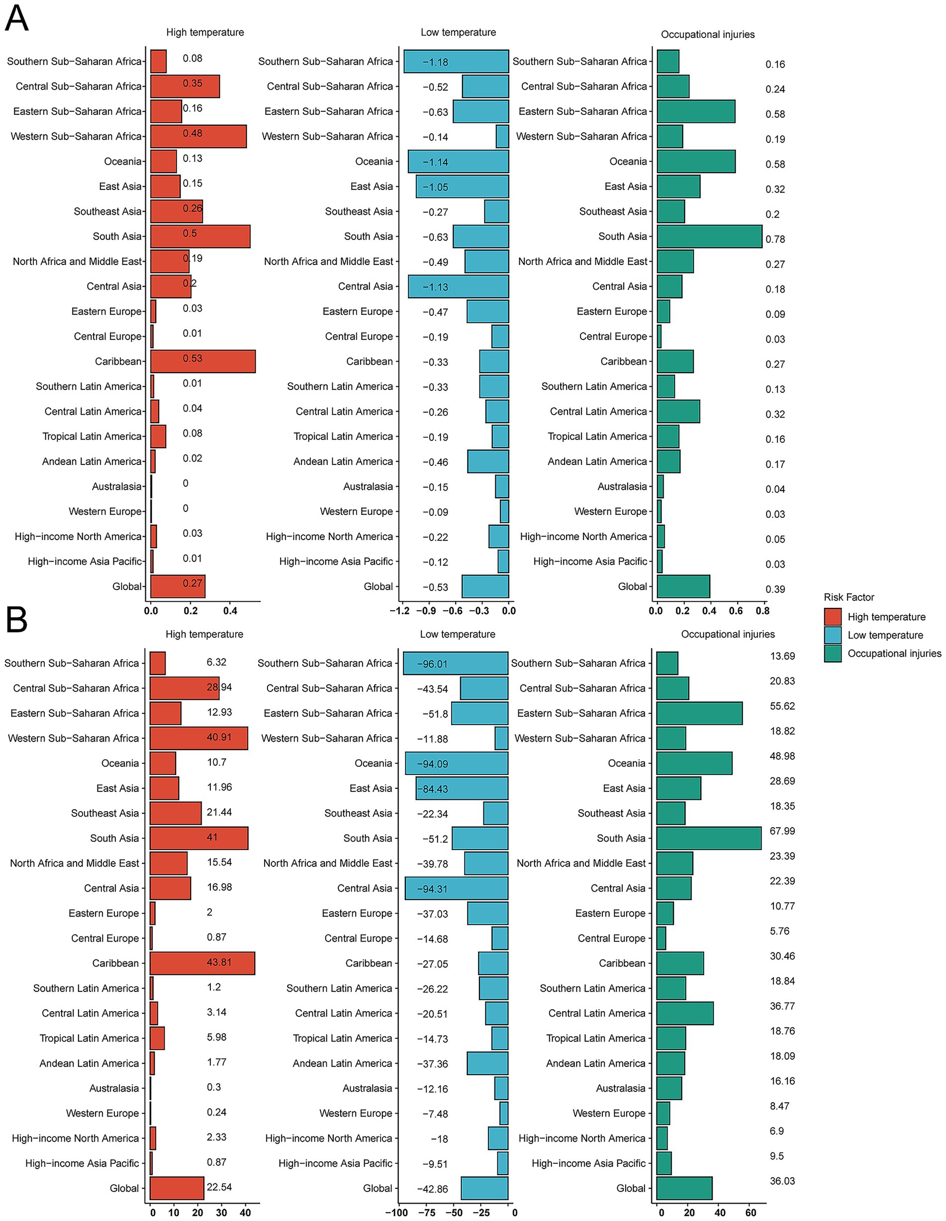 The GBD framework identified three principal risk factors for unintentional injuries in children and adolescents: occupational injuries, low temperature, and high temperature. Occupational injuries accounted for a global mortality rate of 0.39 per 100,000 population (95% UI 0.34–0.44). High temperature contributed 22.54 DALYs per 100,000 globally (95% UI 10.10–32.27); the Caribbean recorded the highest regional burden at 43.81 DALYs per 100,000 (95% UI 26.31–61.99) (Figures 7A,B).