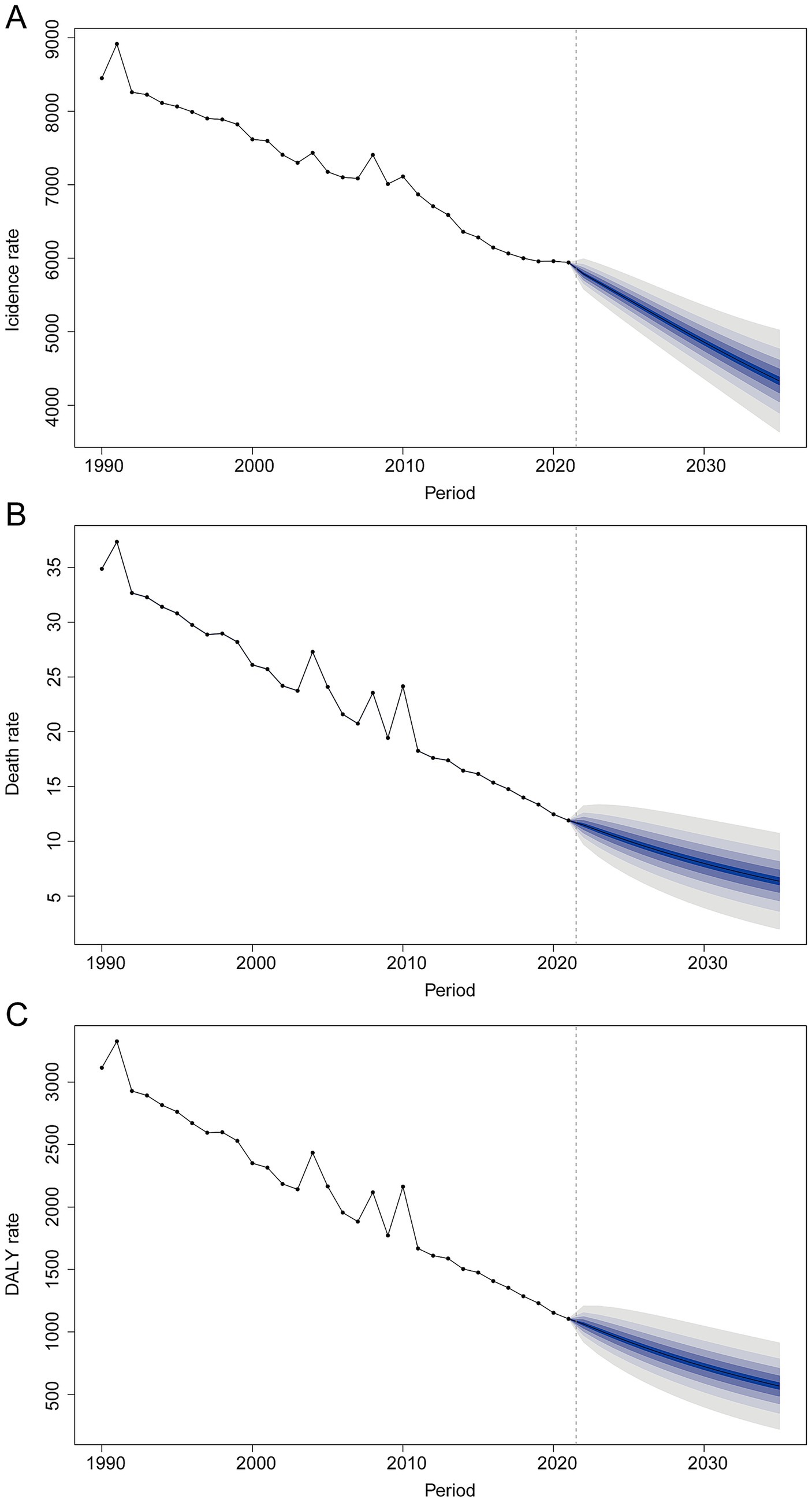 Figure 8. Bayesian age–period–cohort (BAPC) projections of unintentional injury burden to 2035. (A) Incidence rate; (B) mortality rate; (C) DALY rate.