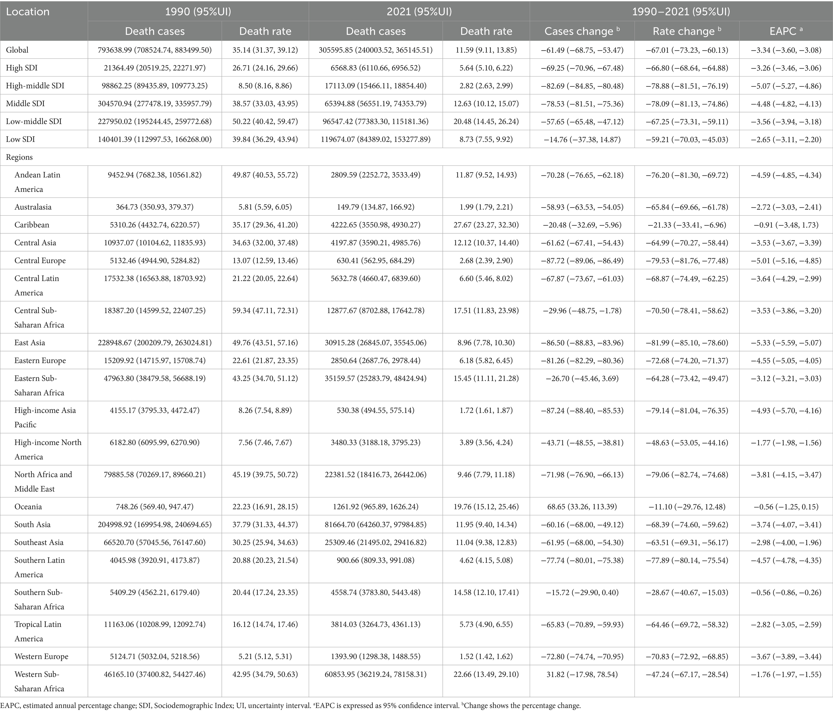 2India also accounted for the highest number of deaths (51,952.47; 95% UI 38,458.49–65,677.49), a 60.99% decrease from 1990 (95% UI –70.14% to −48.12%). Haiti registered the greatest mortality rate (61.86 per 100,000; 95% UI 50.86–73.32). The Republic of Korea achieved the sharpest decline (EAPC –7.21; 95% CI –7.59 to −6.83), while Zimbabwe showed the largest rise (EAPC 2.41; 95% CI 1.79–3.03) (Supplementary Table S3; Figures 5D–F). The global mortality rate was 11.59 per 100,000 (95% UI 9.11–13.85), with 68 countries above and 136 below the mean (Figure 5K).