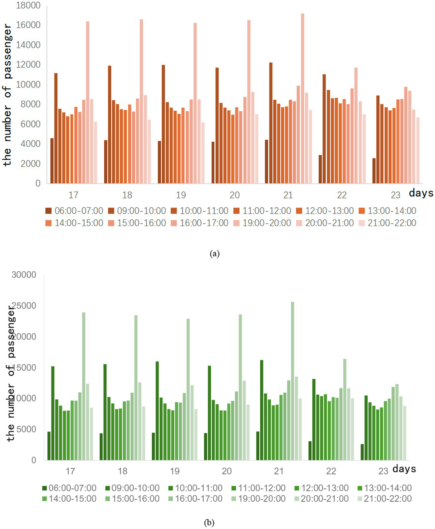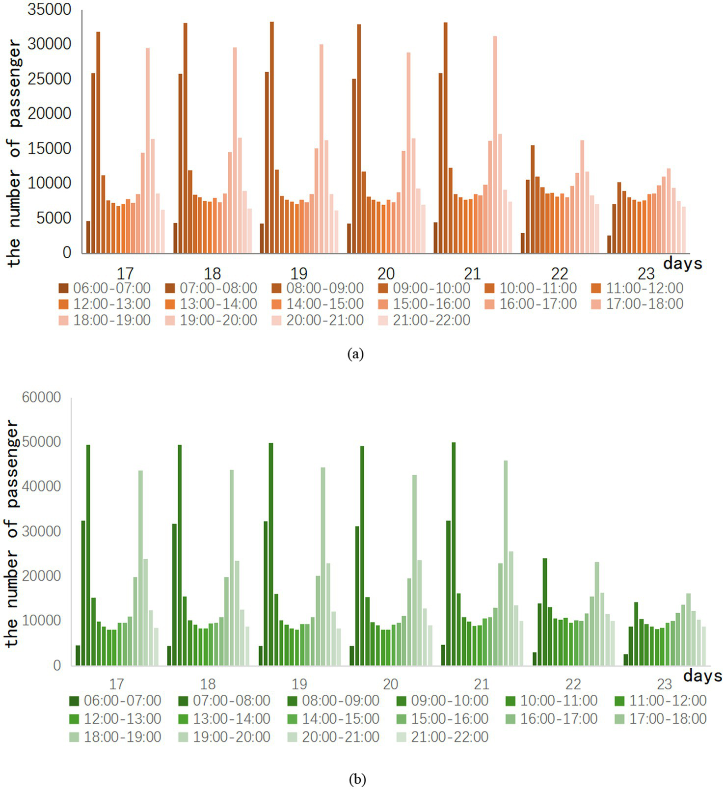 In the week after the epidemic eased, the hourly passenger flow of Lines A and B had a clear trend of morning and evening peak changes every day. This indicates that the distribution of passenger traffic is concentrated in the morning and evening peaks. Hourly ridership peaks in the morning and evening when commuting demand resumes. In contrast, the flow variability in the morning peak is more apparent than in the evening peak. The 22nd and 23rd days are weekends, and the weekend traffic still has the morning and evening rush hours. However, the difference between peak and peak traffic on weekends is clearly not as obvious as on weekdays. For example, the 21st day is a Friday. There is a difference of 29,081 passengers between the highest and lowest passenger flow of the day on Line A, and 45,281 passengers between the highest and lowest passenger flow of the day on Line B. On the second day, there was only a difference of 13,406 passengers between the highest and lowest passenger flow of the day on Line A, and only 20,994 passengers between the highest and lowest passenger flow of the day on Line B.
