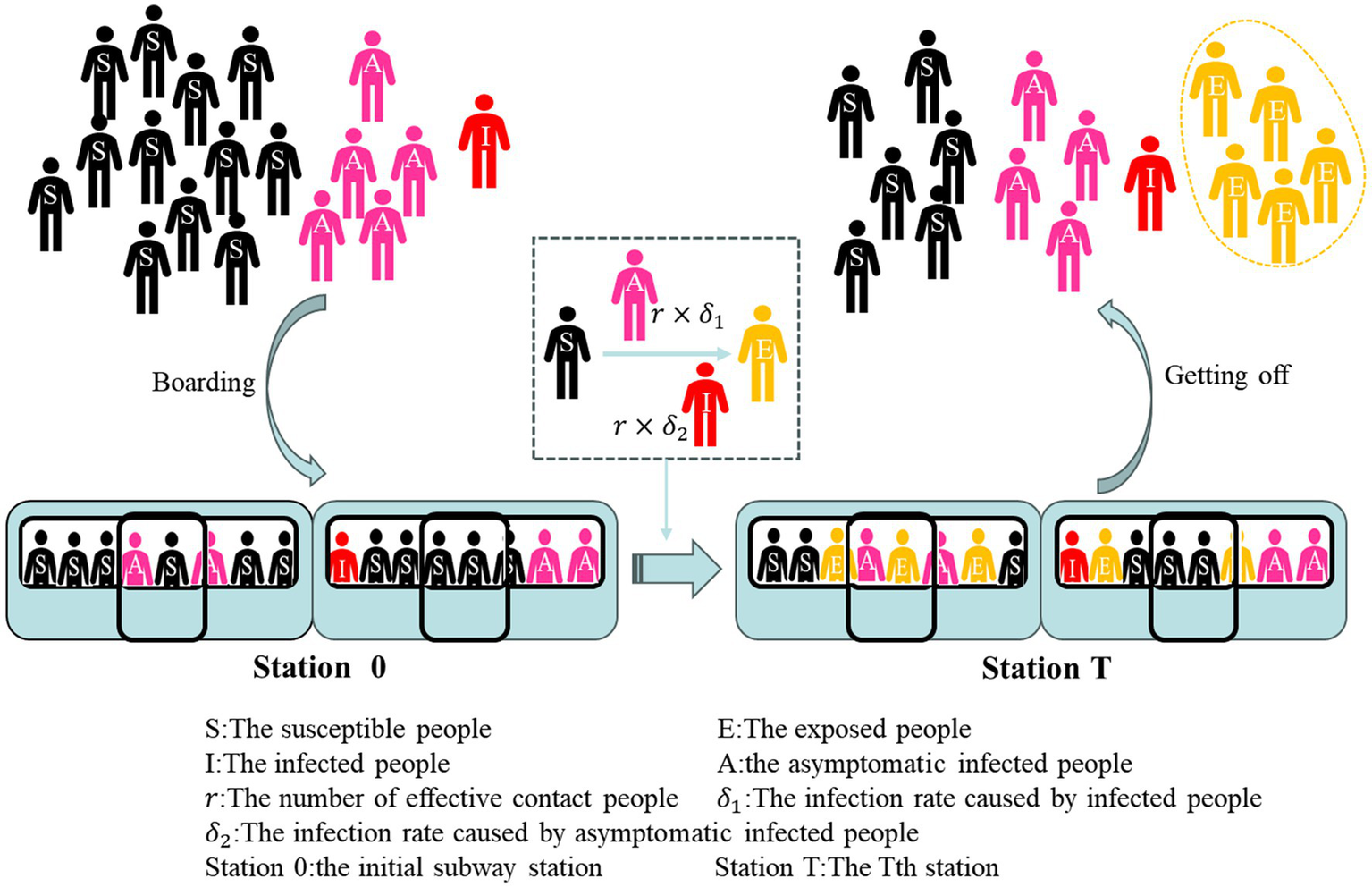 During a subway operation, a propagation process was mainly carried out inside the subway car that susceptible group (S) is converted into exposed group (E) by contact with symptomatic infected group (I) or asymptomatic infected person A. The rate of susceptible people to exposed populations in the original SEIR model β is substituted by the rate of and in the SEIA model of subway simulation. This rate is made up of the product of the number of effective contact people and the infection rate of the infected group and the asymptomatic infected group, respectively. The purpose of splitting the parameters into two categories is to distinguish the infected group from the asymptomatic infected group, and at the same time provide conditions for the simulation of subway epidemic prevention countermeasures.