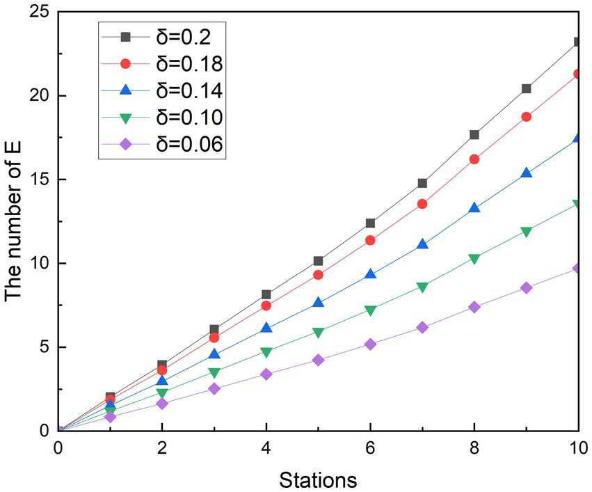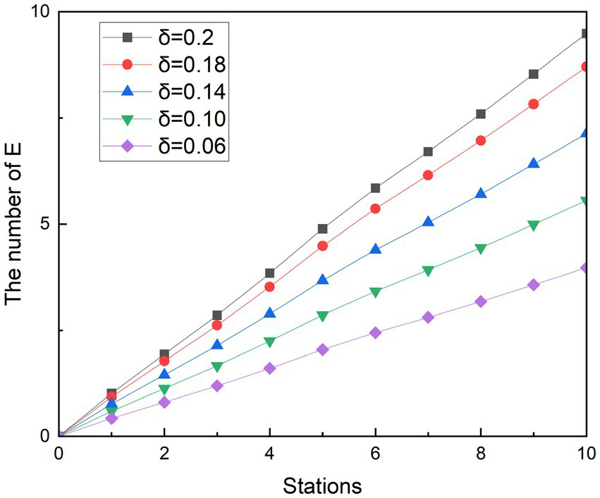 Simulating the ridership during the peak hours of the subway is obtained as shown in Figure 6. During the whole operation of the subway, the exposed showed a gradual upward trend. And as the subway passes through the stops, the growth rate of the 1st to 2nd, 3rd to 5th, and 8th to 9th stations is smaller than that of the previous station, and the growth rate of other stations is higher than that of the previous station. Since each curve in the graph has such a feature, it is assumed that this trend feature is not related to the change in . It was observed that when the number of people getting off at the station was greater than the number of people getting on the subway, the growth rate in that interval decreased. Therefore, it is speculated that the change in the growth rate of the exposed population is related to the change in the density of the people in the subway. With the decreasing of value, the growth rates of the group of E are controlled. At its peak, the number of probable infections at the last stop dropped from 23.20 to 21.28, 17.44, 13.58, and 9.71, respectively. Compared with the control group, the number of people who could be infected decreased by 8.27, 24.85, 41.48, and 58.14%, respectively. During the off-peak period shown in Figure 7, except for the growth rate of the exposed population at stations 1 to 2 and 4 to 6, the growth rate of other sites is gradually increasing compared with the previous station. Similarly, such changes are also associated with changes in the density of people in subway cars during the off-peak period. The number of probable infections in the last leg dropped from 9.49 to 8.70, 7.13, 5.56, and 3.97, respectively. Compared with the control group, the number of people who could be infected decreased by 8.27, 24.84, 41.46, and 58.13%, respectively.