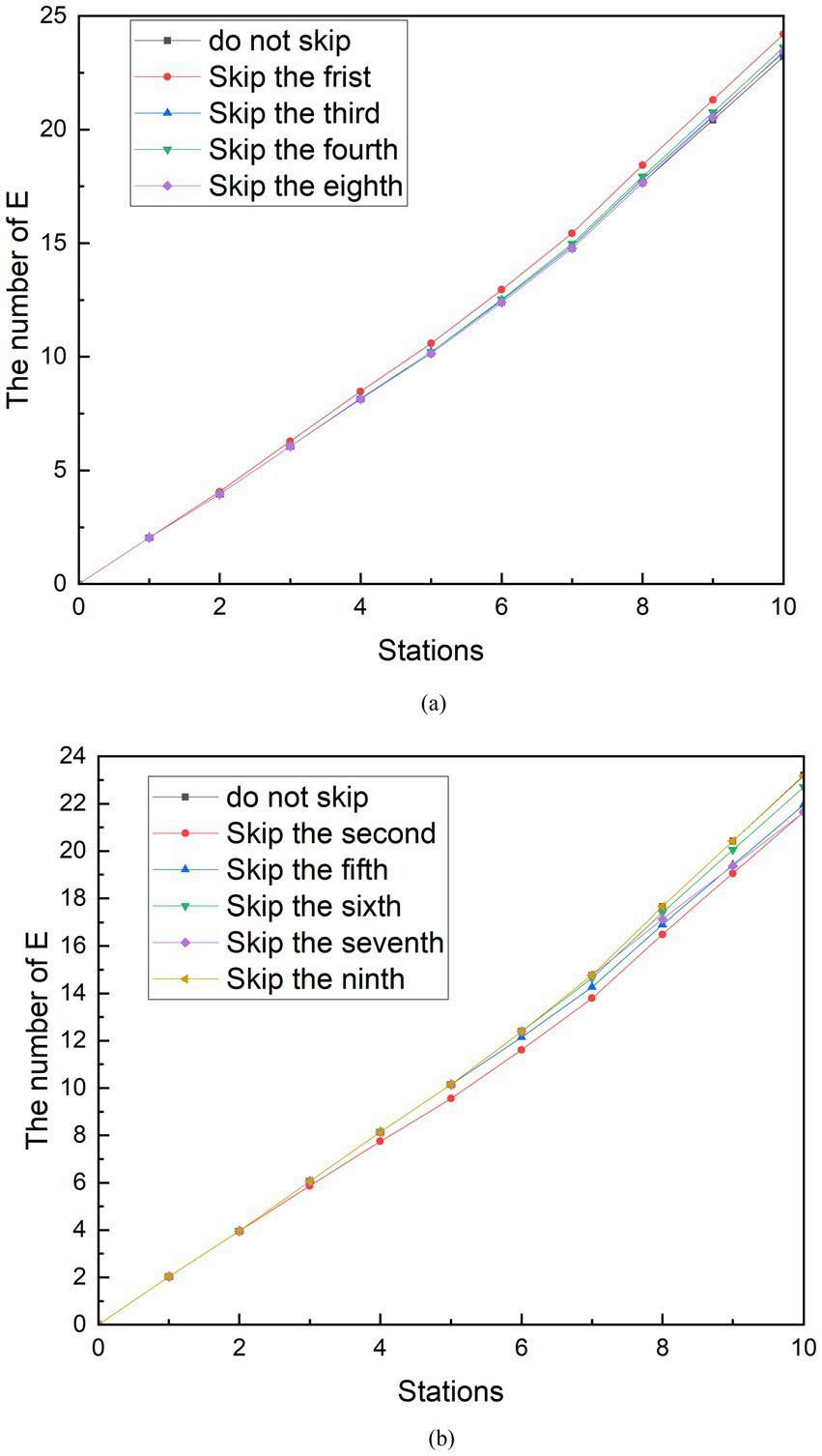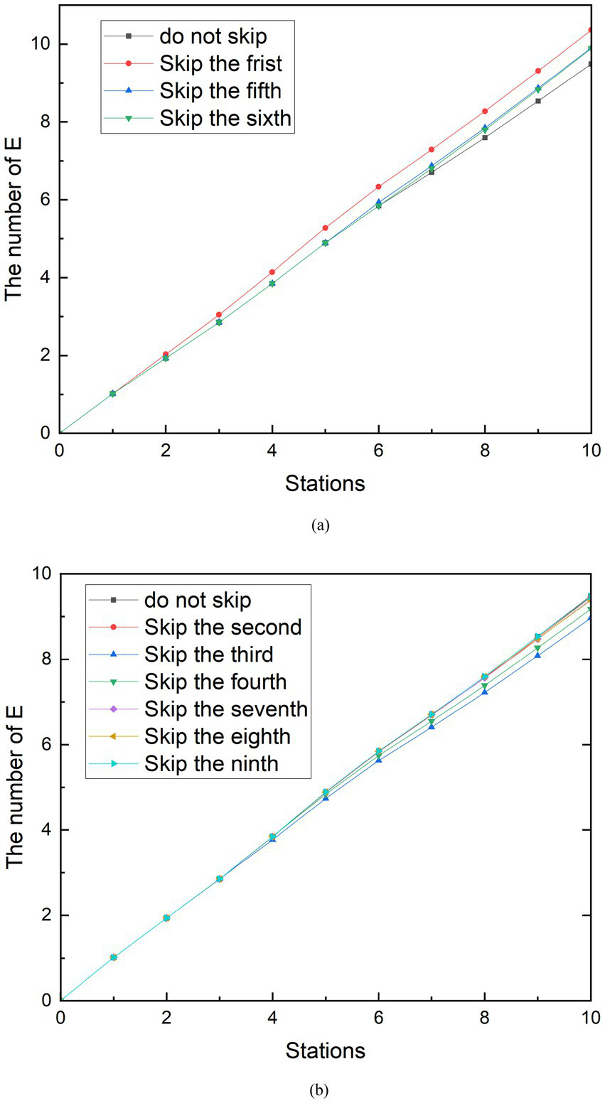 The simulation results of measures to reduce stops during off-peak hours can be seen in Figure 9. In addition to the existence of similar results to the peak, another characteristic was found. Similarly, because stopping at stops 1, 5 and 6 reduces the density of people in the subway, skipping these stops increases the number of exposed people. Stops at stops 2, 3, 4, 7, 8, and 9 increase the density of people in the metro car, and skipping these stops reduces the number of exposed people. However, among these sites, the skipped stations that minimized group E was the third, and the number of exposed persons at the tenth station was 8.97, a 5.52% reduction compared to no skipping. The difference in the number of people getting on and off at the third station is 37. Unlike station 6 during peak hours, the third station is not the station that best increases the number of people in the subway. The station that can increase the number of people in the subway during the off-peak period is the ninth station, and the difference in the number of people getting on and off the train is 92. After analysis, the reason for this result is that there is a large difference in the number of stations between the third station and the ninth station, and the subway passes through the third station first. Observing Figure 9, it can be seen that in the case of reducing stops, the curve before the skipping is carried out and the curve without reducing the stops are perfectly fitted. Until the skipping was carried out, the growth rate of the E group suddenly decreased compared to the growth rate of the no skipping group. Therefore, the earlier the shipping is performed, the sooner the growth rate of the E group decreases. Although the difference in the number of people getting on and off at station 9 is greater than that at station 3, the number of exposed people cannot be minimized because the growth rate of group E begins to decrease at the end of the metro journey. A similar phenomenon exists when looking at the simulation of reduced stops during peak periods.