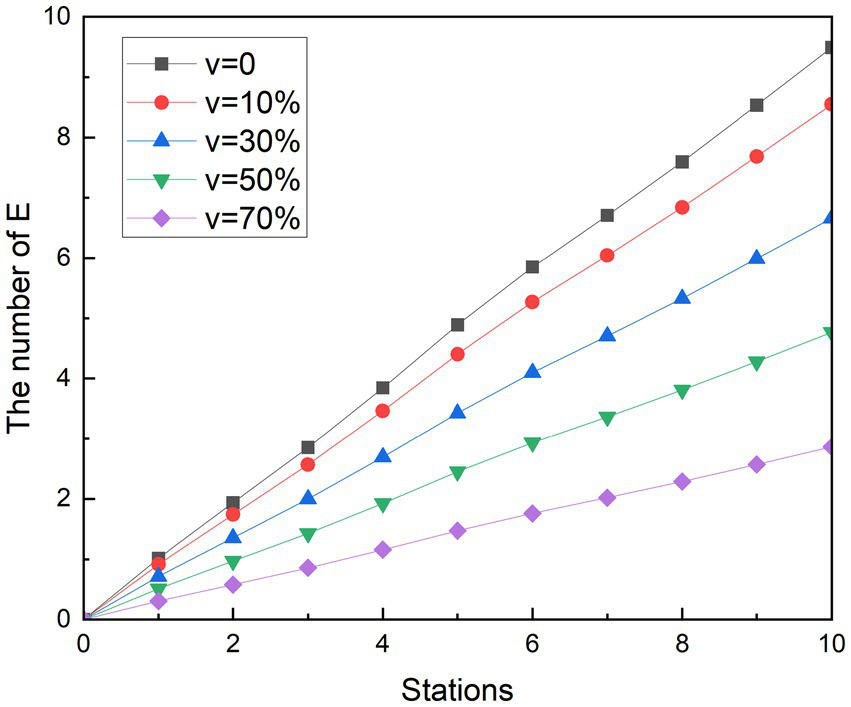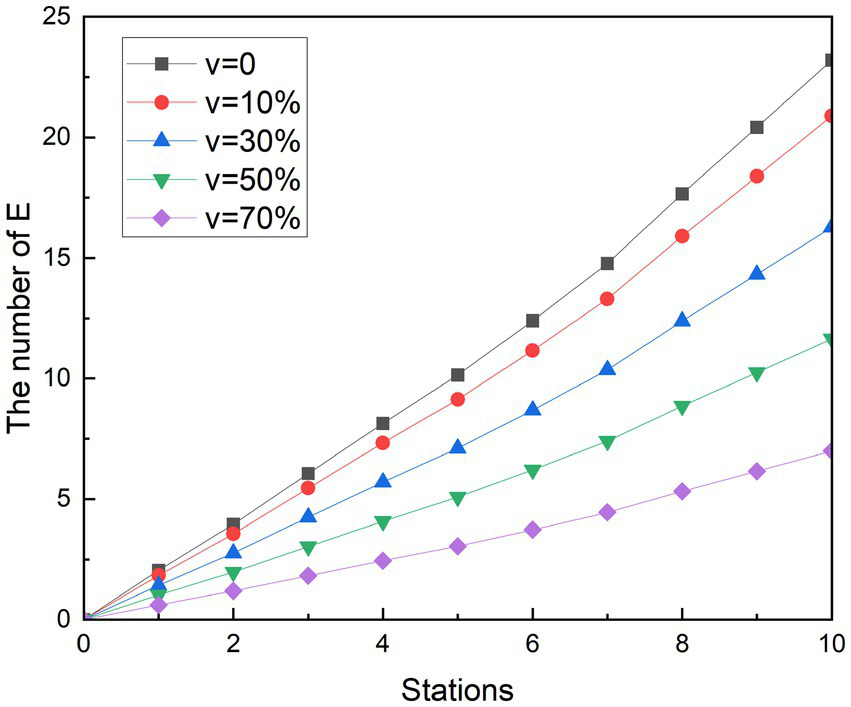Among the curves of E under different measures during the off-peak period, the E curve of vaccination was still the lowest average growth rate among all curves. In addition, the change in the E-curve of the operation measures of reducing the number of stopping station is similar to that of the peak period, and the trend is similar to that of the curve of the number of potential infected people who have taken only basic measures, and the number of people is also relatively close. This indicates that the reducing the number of stopping station measures are relatively poorly implemented in the measures studied. In terms of the final number of probable infected person E, at station 10, the number of exposed people with keeping a distance was 7.88, the final number of exposed people with vaccination measures was 8.00, and the number of people with reducing the number of stopping station was 14.52. Compared to the number of possible infections with only basic protection measures, the number of group E decreased by 7.17, 7.05, and 0.53, respectively. The number of exposed people with epidemic prevention measures decreased by 47.64, 46.84, and 3.52%, respectively, compared with those who only took basic protection measures.