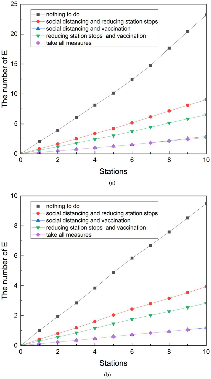 When combined with individual measures and combined measures, it can be found that four of three the combined measures generate fewer E populations than the individual implementation measures. Only when vaccination is carried out independently will produce fewer exposed people than the number of exposed people produced by social distancing combined with reduced stops. Based on the simulation model established in this study, the number of exposed groups was observed after 10 stations of subway operation. With the goal of reducing the number of exposed groups, all measures were ranked from obvious to ineffective: taking all measures, social distancing and vaccination, reducing stops and vaccination, vaccination, social distancing and reducing stops, social distancing, and reducing stops.