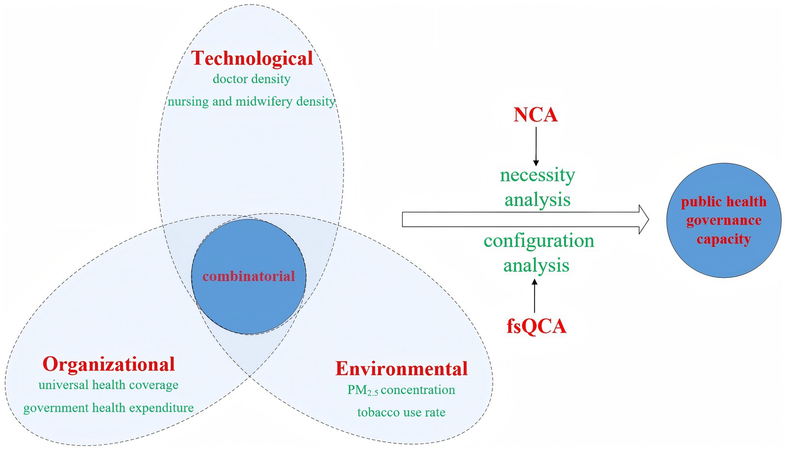 Venn diagram illustrating factors influencing public health governance capacity. Three overlapping circles labeled Technological (doctor density, nursing and midwifery density), Organizational (universal health coverage, government health expenditure), and Environmental (PM2.5 concentration, tobacco use rate) converge on a combinatorial section. An arrow connects this section to public health governance capacity, highlighting necessity and configuration analysis. Terms NCA and fsQCA are noted.