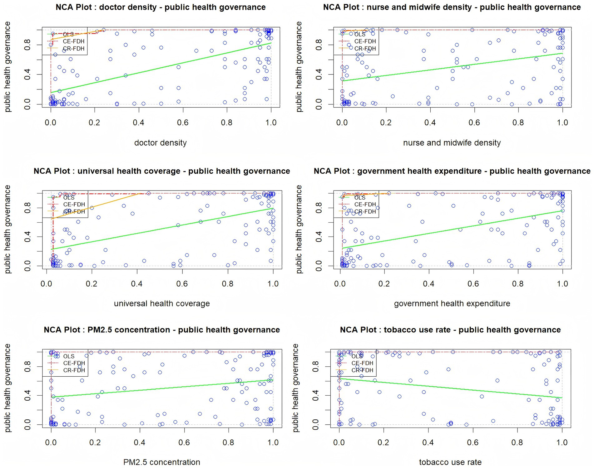 Six NCA plots illustrating correlations between public health governance and various factors: doctor density, nurse and midwife density, universal health coverage, government health expenditure, PM2.5 concentration, and tobacco use rate. Each scatter plot includes data points, trend lines for OLS, CE-FDH, and CR-FDH methods, showing varying degrees of association between the x-axis factors and public health governance on the y-axis.