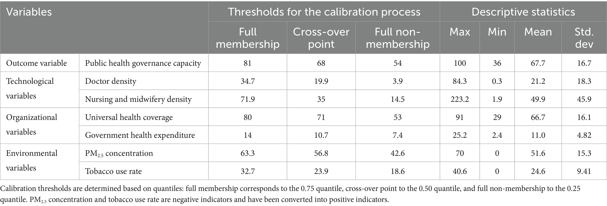 In fsQCA, calibration refers to the process of assigning set membership to cases. Specifically, researchers must calibrate variables into sets based on existing theoretical knowledge and case contexts. Calibrated set membership scores range between 0 and 1. To calibrate variables within this interval, researchers select calibration anchor points (full membership, crossover point, and full non-membership) by examining the actual distribution of variable values and considering case-specific contexts. Drawing on existing research, this study employs direct calibration (Ragin and Fiss (100)) to convert data into fuzzy-set membership scores, grounded in theoretical and empirical knowledge. The calibration process involved three key steps: (1) calculating quantiles at 0.75, 0.50, and 0.25 for each variable; (2) establishing 0.75 quantile as the full membership threshold, 0.50 as the crossover point, and 0.25 as the full non-membership threshold; (3) Cases with a calibrated membership score of 0.5 for outcomes or antecedents are automatically removed by the software, which can compromise result accuracy. Following existing research, I add a constant of 0.001 to all data with a calibrated membership score of 0.5. Notably, PM2.5 concentration and tobacco use rate are negative indicators, meaning that higher values indicate poorer environmental conditions. The following formula was used to convert them into positive indicators: Transformed value = Maximum value of the original indicator in the sample—Original value. This transformation ensures the directional consistency of all antecedent variables, with higher transformed values corresponding to more favorable conditions (e.g., lower PM2.5 concentration or lower tobacco use rate), thereby aligning their logic with positive indicators. Calibration was performed after this transformation. The calibration results and descriptive statistics for all outcome and antecedent variables are presented in Table 1.