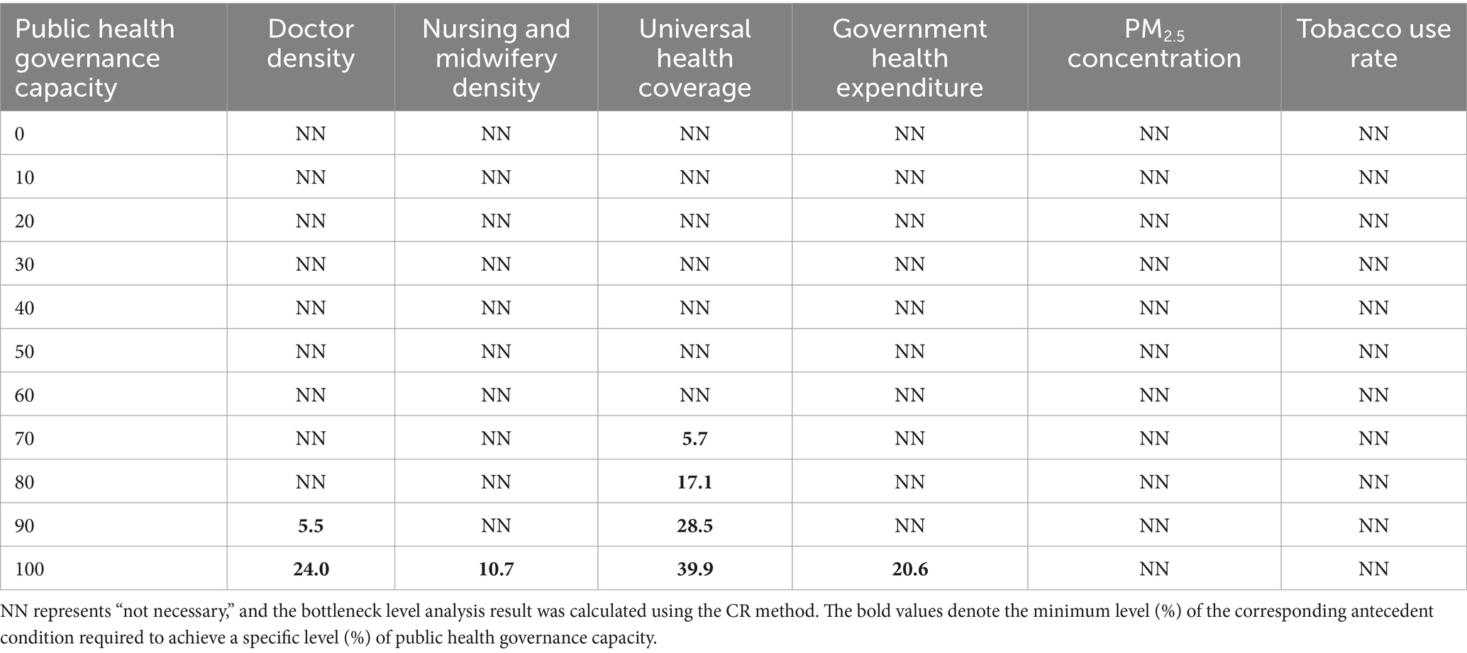 A further analysis explored the bottleneck levels. These levels represent the specific threshold within an antecedent condition’s maximum observed range that is necessary to achieve the result’s maximum observed scope. As illustrated in Table 3, the bottleneck level analysis reveals nuanced insights into public health governance capacity. To achieve 70% of public health governance capacity, a 5.7% universal health coverage is required. To achieve 80% of public health governance capacity, a 17.1% universal health coverage is required. To achieve 90% public health governance capacity, doctor density must be at least 5.5% and universal health coverage must reach 28.5%. At the maximum 100% public health governance capacity, doctor density must reach 24.0%, nursing and midwifery density 10.7%, universal health coverage 39.9%, and government health expenditure 20.6%. These findings underscore that higher levels of public health governance capacity are constrained by the simultaneous interaction of multiple conditions.