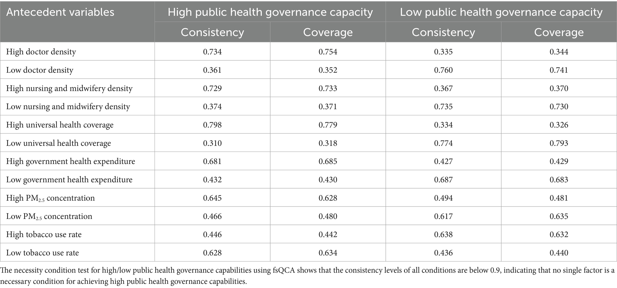 I employed fsQCA to validate the robustness of the NCA results. Following Fiss (126), a condition is considered necessary for an outcome when its consistency level exceeds 0.9. Table 4 presents the necessity condition test results for high and low public health governance capacities. The analysis reveals that all conditions exhibit consistency levels below 0.9, thereby suggesting no necessary conditions exist for either high or low public health governance capacity. These findings are consistent with the NCA method’s previous results. The analysis demonstrates that public health governance capacity emerges from the complex interaction of multiple factors rather than being determined by a single condition, thus necessitating a configuration analysis.