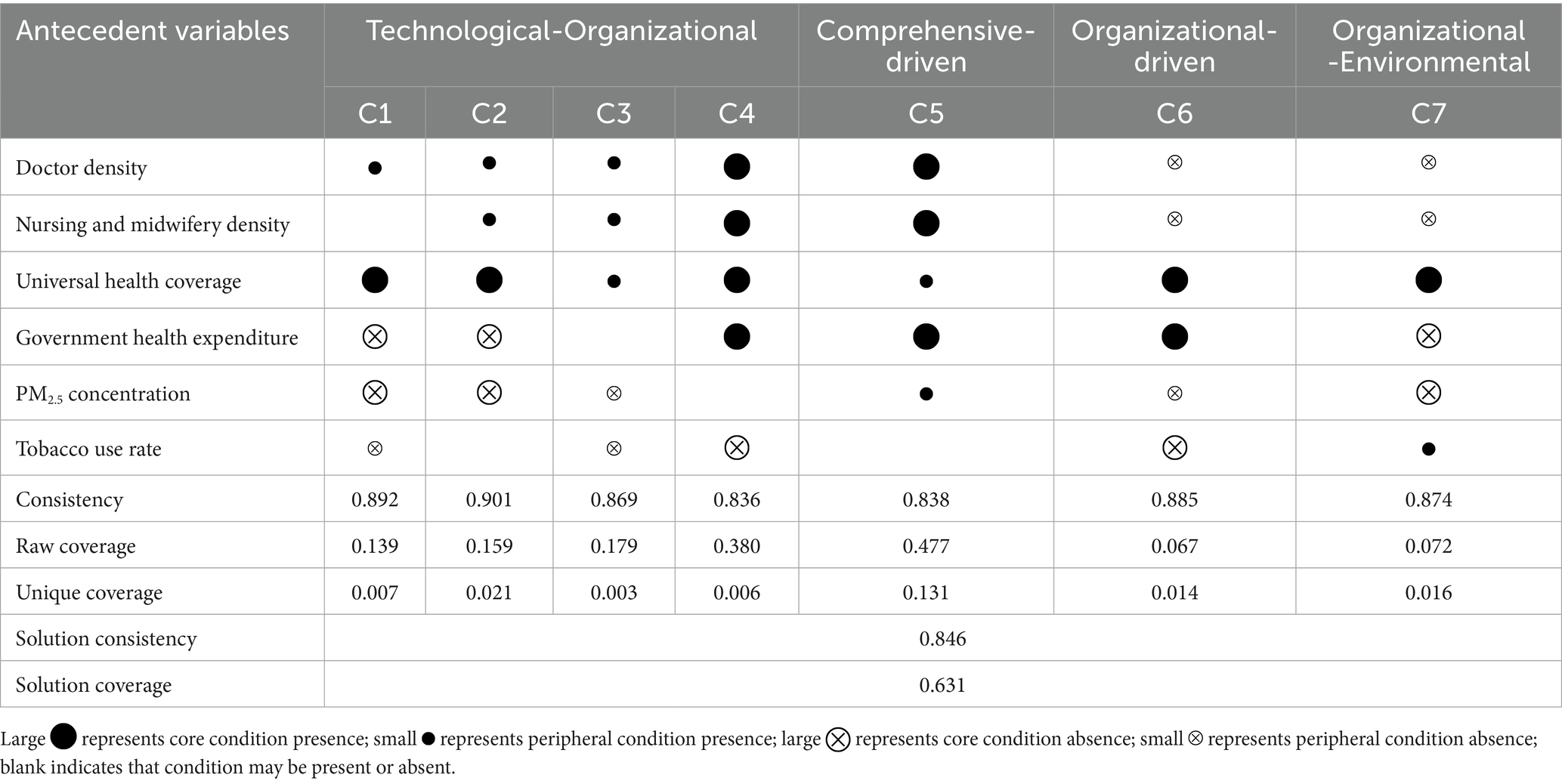 Drawing on existing public health governance theory, this study selected six critical antecedent conditions and employed counterfactual analysis to examine their differential impacts on public health governance capacity. Specifically, by comparing the nested relationships between intermediate and parsimonious solutions, the research identified core and peripheral conditions influencing public health governance capacity. Factors simultaneously present in both intermediate and parsimonious solutions were characterized as core conditions, while factors existing only in intermediate solutions but absent from parsimonious solutions were defined as peripheral conditions, thereby clarifying the relative importance of various conditions within configurations. The fsQCA analysis results are illustrated as shown in Table 5. In this table, large A completely black circle filling the entire frame.represents core condition presence, small It seems there was an issue with the image. Please try uploading the image again or provide a URL if possible. represents peripheral condition presence, large It seems there was an issue displaying the image. Please try uploading it again or provide a URL. represents core condition absence, small Please upload the image or provide a URL so I can help you create the alternate text. represents peripheral condition absence, and a blank indicates that condition may be present or absent.