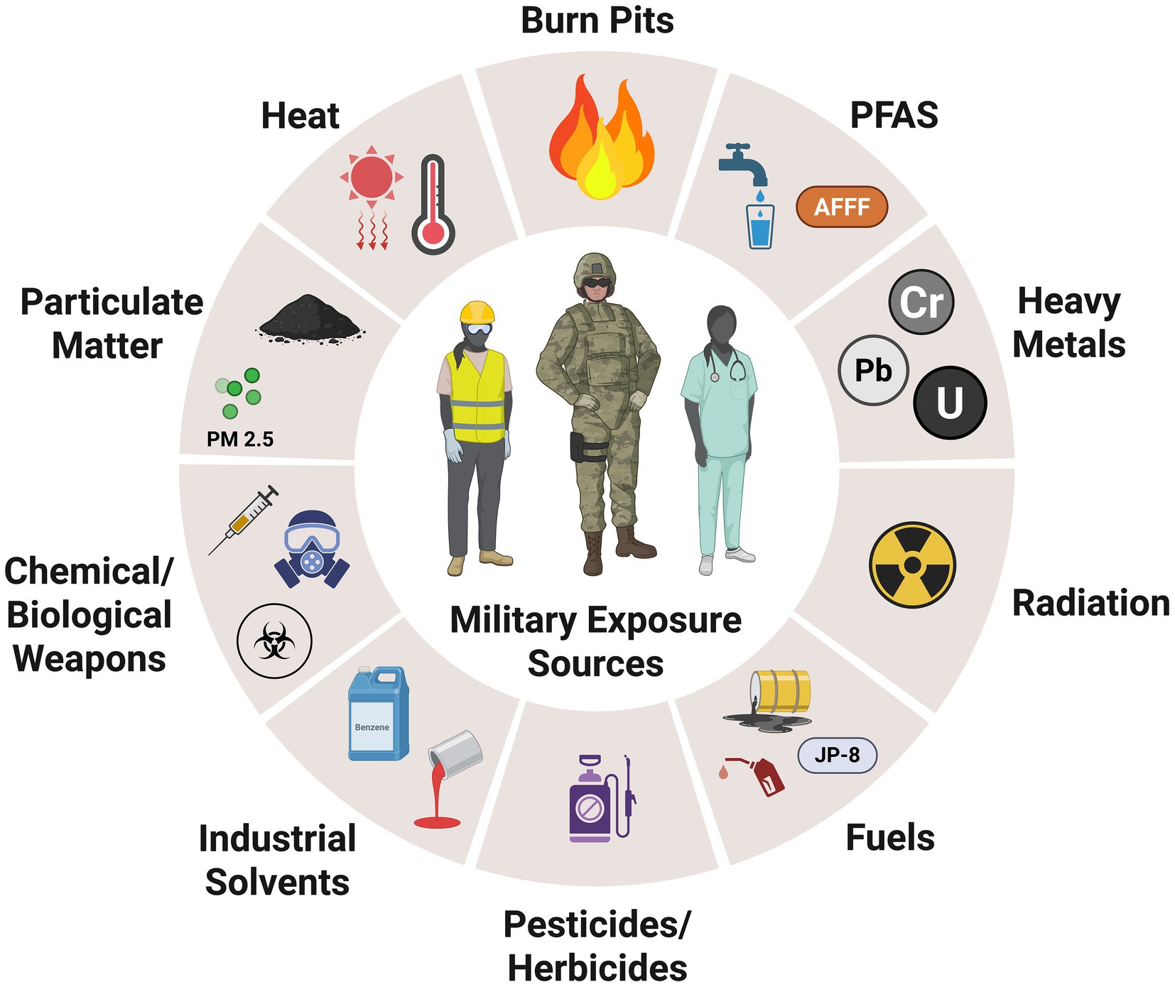 Military service inherently involves exposure to a variety of environmental and industrial hazards that can have lasting health consequences for both women and their offspring. Active-duty military women, who are often in their prime reproductive years, are particularly vulnerable to harmful chemical exposures that can disrupt hormone regulation and impair fertility (2–4). For women who become pregnant while serving, military exposures may pose increased risks for pregnancy complications including miscarriage, preterm birth, low birth weight, and congenital anomalies (4–8). These exposures include toxic substances such as burn pit emissions, airborne particulates, heavy metals, industrial solvents, fuel combustion byproducts, and pesticides (9–11) (Figure 1). Women serving in deployed settings may also encounter unsafe water sources, contaminated soil, increased routine and/or deployment-specific vaccinations, and prolonged exposure to extreme temperatures (9, 10), all of which may pose potential risks to reproductive health.