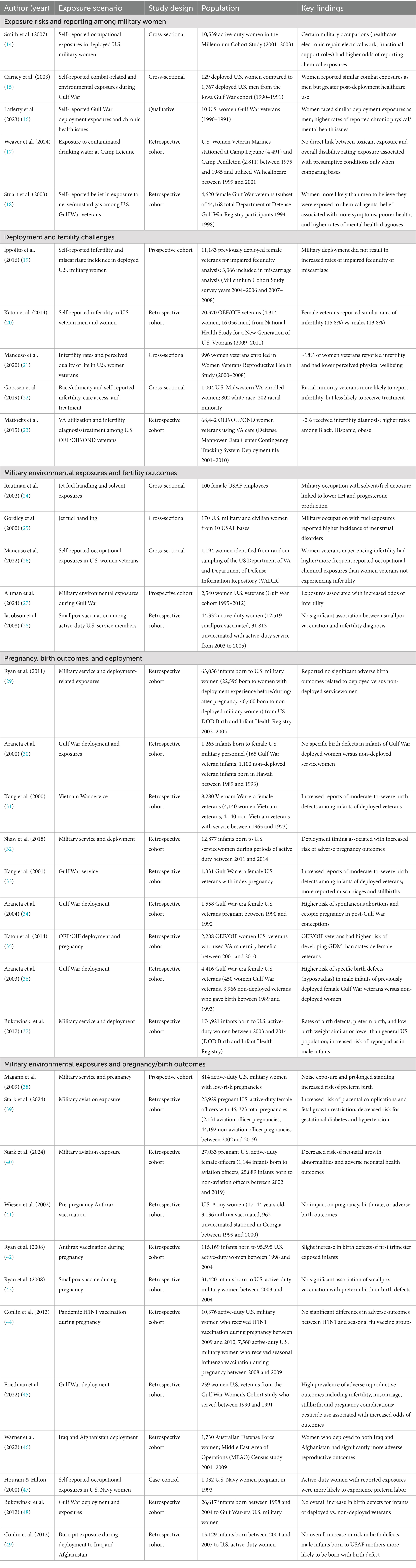 Understanding the lasting impact of military-related environmental exposures is essential for enhancing health outcomes and ensuring better access to care for servicewomen and veterans, especially during their transition to civilian life. As the Department of Veterans Affairs (VA) expands women-centered healthcare services (3, 12, 13), further research is needed to assess the reproductive effects of military service, identify high-risk exposures, and develop policies that mitigate potential health risks. Additionally, increasing awareness and education on these risks among both healthcare providers and service members will be essential in ensuring early intervention and targeted preventive measures. In this mini review, we examine studies on the impact of military environmental and occupational exposures on reproductive health outcomes in active-duty and veteran women (Table 1). Additionally, we identify gaps in understanding female-specific health concerns related to these exposures and highlight key areas for future research.
