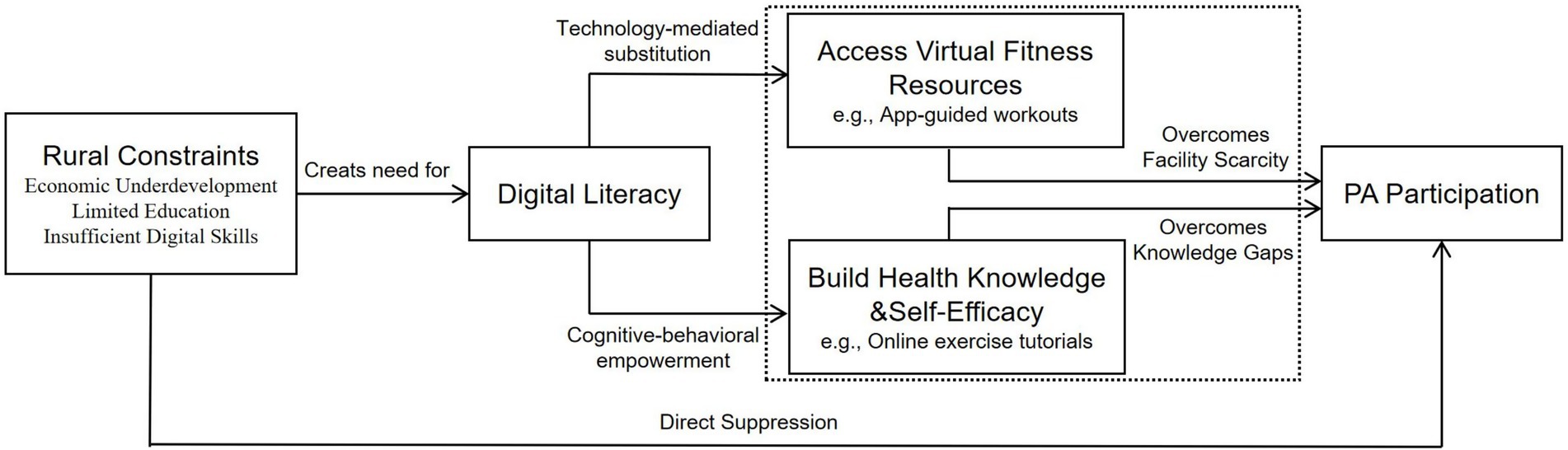 Technology-mediated resource substitution (Figure 1) enables rural residents to leverage mobile fitness apps (Keep, WeChat Sports, Fitime) and online platforms (Bilibili, Douyin) for structured exercise regimens, effectively compensating for scarce professional trainers, gym infrastructure, and formal physical education. Empirical studies confirm that digitally literate rural older adults are significantly more likely to use fitness apps and seek exercise information online, overcoming spatial constraints (35). Critically, digital home-based programs demonstrate efficacy comparable to in-person training for improving functional capacity, body composition, and aerobic fitness in resource-limited settings (38, 39). However, meta-analytical evidence indicates digital interventions fail among low-SES individuals without adequate digital competencies (4), underscoring digital literacy’s role as the essential enabler that transforms passive access into active health engagement.