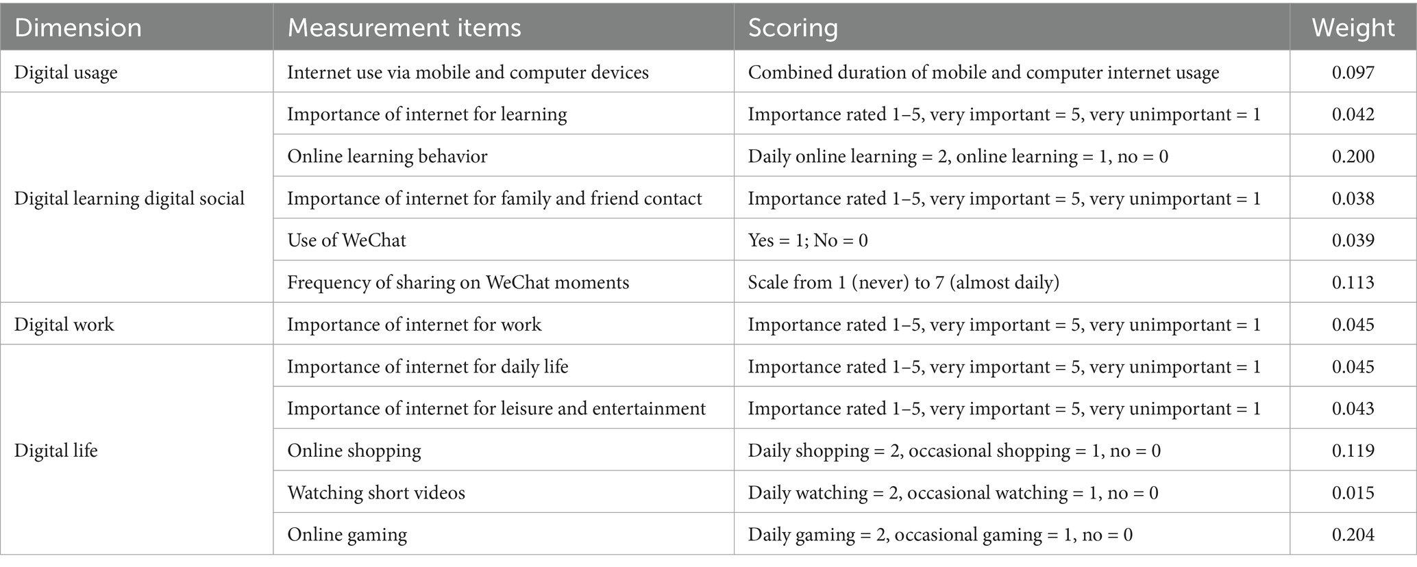Drawing upon established methodologies (27, 28), digital literacy was quantified via a composite index derived from 12 items across five domains (digital usage, learning, social engagement, work applications, and daily life integration). Each item was normalized, and weights were assigned using Shannon entropy to objectively reflect discriminative power (Appendix A). The result standardized index ranges from 0 (lowest proficiency) to 1 (highest proficiency). Table 1 provides a breakdown of the digital literacy index, including its dimensions, measurement items, scoring, and the weights assigned by the entropy method.