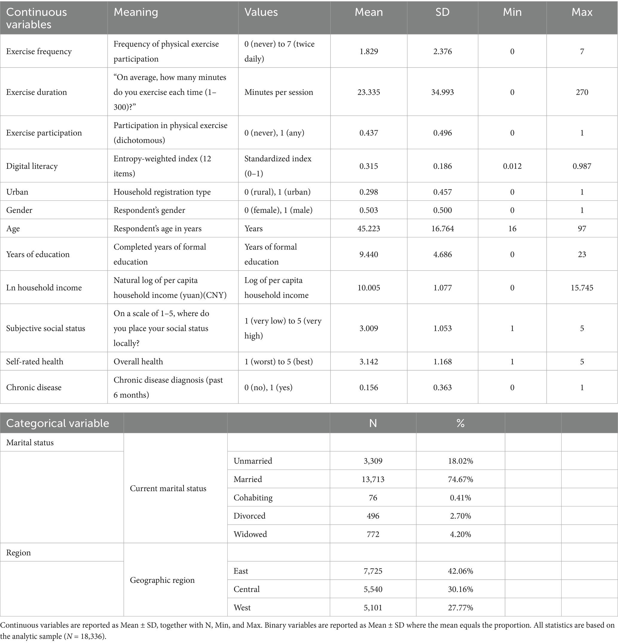 Multilevel confounders were incorporated to mitigate omitted-variable bias. Individual-level controls included sociodemographic attributes (household registration type, gender, age), socioeconomic status (education years, marital status, logarithmic family income), health capital (self-rated health, chronic disease status) (29). And subjective social status is included because lower perceived social rank is associated with reduced physical exercise participation and poorer health behaviors, even after adjusting for objective socioeconomic indicators (30, 31). Evidence from the Chinese aging population further indicates that subjective social status influences exercise engagement through social trust (32), underscoring its relevance in the Chinese context. At the regional level, fixed effects control for spatial heterogeneity arising from regional developmental differences (33). Operational definitions and descriptive statistics are detailed in Table 2.