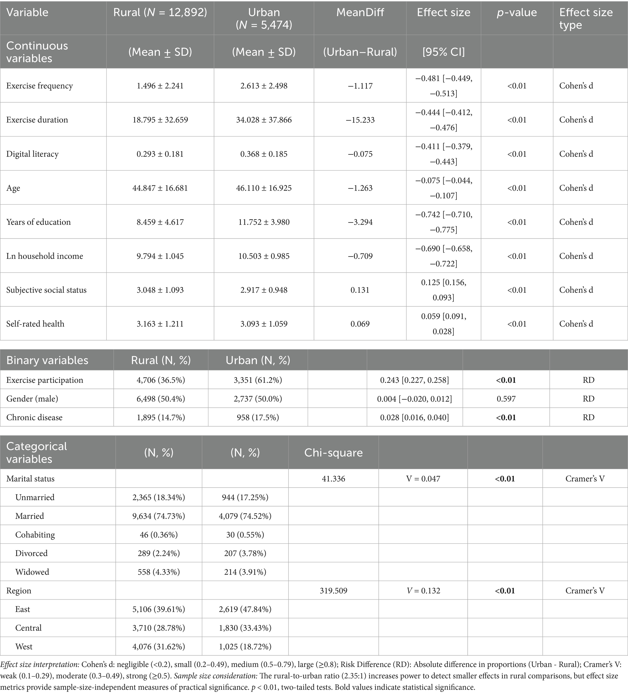 Substantial urban–rural disparities in physical exercise participation and socioeconomic characteristics are evident in Table 3 (all p < 0.01). Urban residents reported higher exercise frequency (M = 2.61, SD = 2.50), corresponding to approximately weekly sessions, whereas rural residents averaged significantly lower frequency (M = 1.50, SD = 2.24), indicating participation below weekly levels (Table 3). Similarly, urban participants engaged in longer exercise durations per session (M = 34.0 min, SD = 37.9) compared to rural counterparts (M = 18.8 min, SD = 32.7). The proportion engaging in any exercise was markedly higher in urban (60.8%) versus rural (36.5%) areas, confirming pronounced behavioral inequities.
