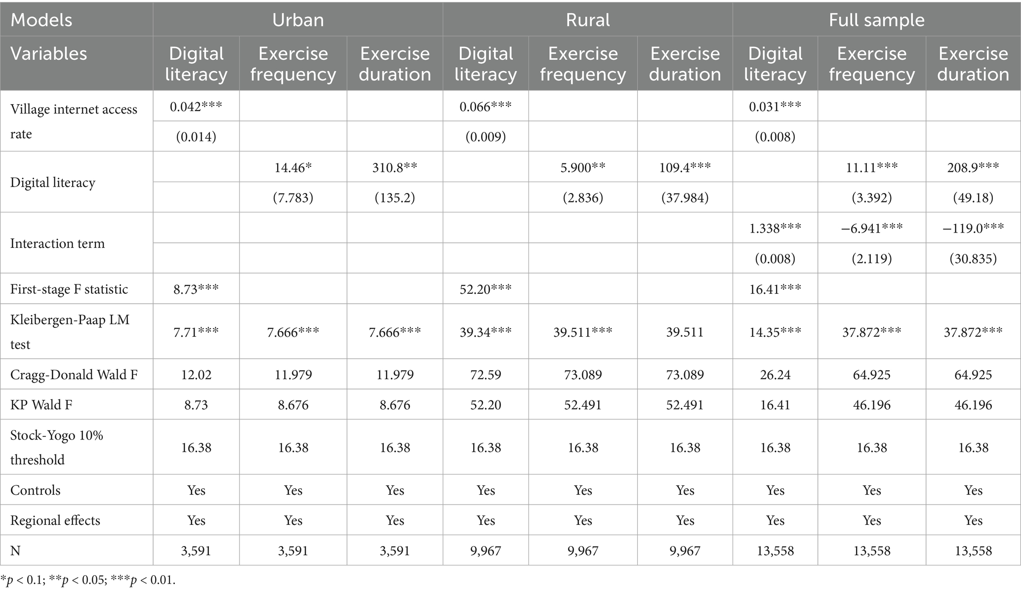 All analyses were conducted in Stata 17.0. Descriptive statistics (means ± SD for continuous variables; proportions for categorical variables) and urban–rural comparisons (t-tests/χ2) were first computed. The digital literacy index was constructed using entropy weighting (Appendix A). Baseline regressions employed OLS for frequency/duration outcomes and logit for binary participation, with province-clustered robust standard errors. To address potential endogeneity, instrumental variable estimation (IV-2SLS) utilized village-level internet access rates as an instrument, subject to diagnostic tests: first-stage F-statistic >10 [relevance threshold (34)], Kleibergen-Paap LM test rejecting under-identification (p < 0.01), and Cragg-Donald/Kleibergen-Paap Wald statistics exceeding the Stock-Yogo 10% critical value (16.38). Sensitivity analyses included: (1) restricting to working-age adults (18–59 years), (2) excluding centrally administered municipalities, and (3) substituting binary participation for frequency/duration. Statistical significance was defined as two-tailed p < 0.05.