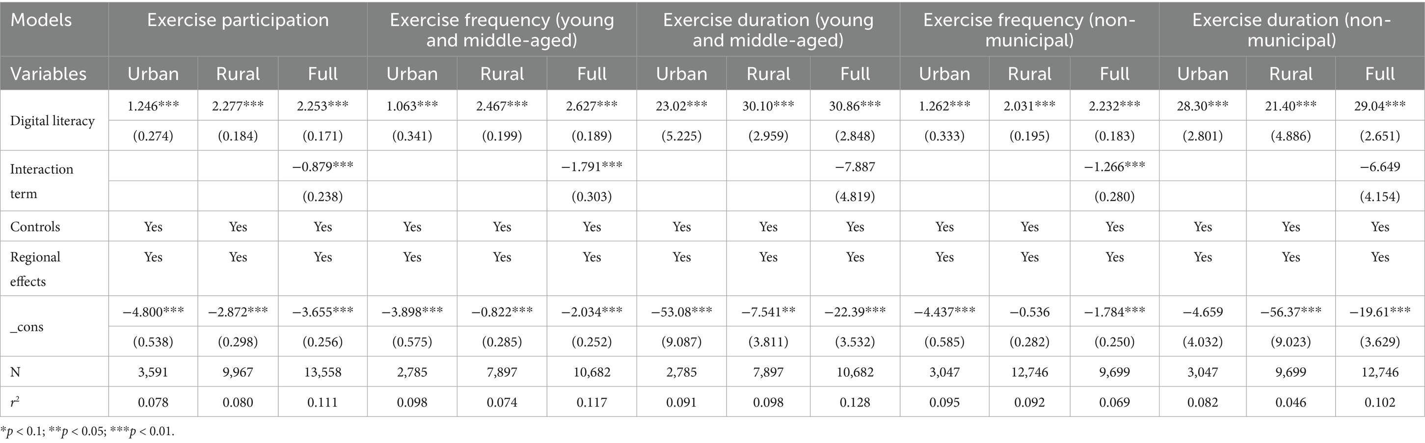 Table 4. Baseline regression results of digital literacy on urban–rural disparity in exercise participation.