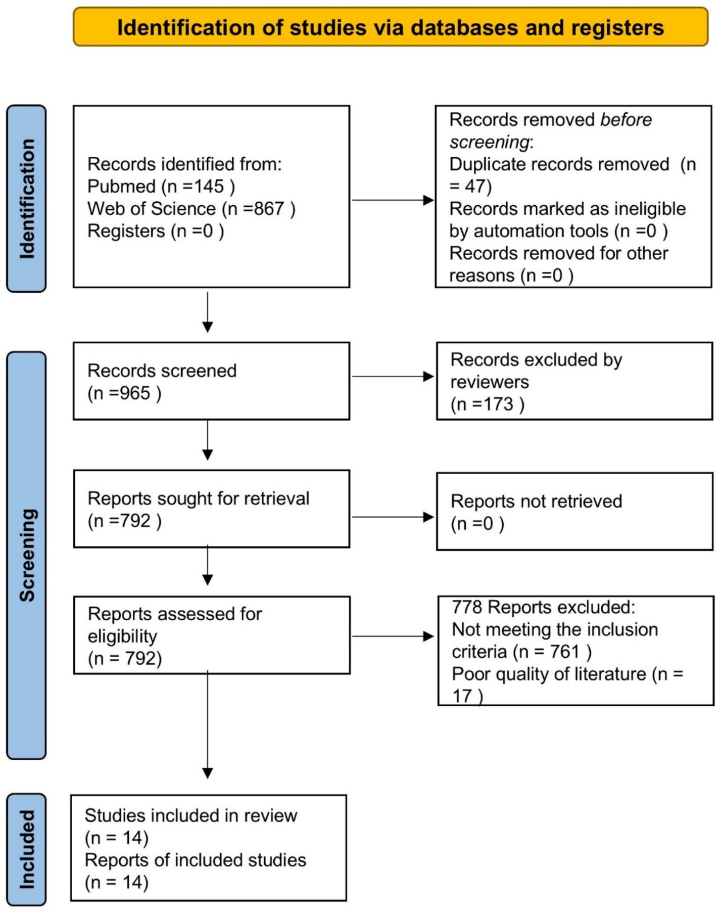 We identified 1,012 records through the search process based on the PRISMA flowchart. After removing 47 records duplicates and 173 records that not meet the type of study, we screened 792 records based on titles and abstracts. Subsequently, we assessed 14 studies in full text and included 778 in our review (Figure 1).