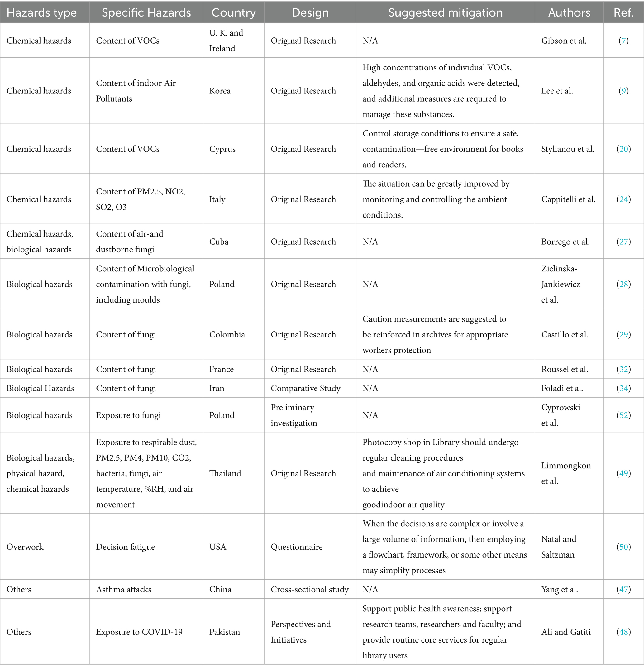 Table 3 summarises the included studies’ characteristics. These studies cover 14 countries: China, Poland, Thailand, USA, Pakistan, U.K., Ireland, South Korea, Cyprus, Italy, Cuba, Colombia, France, and Iran. They use diverse designs: cross-sectional, preliminary investigations, original research, questionnaires, perspectives and initiatives, and comparative studies. Most participants are archivists, though some studies do not specify the number. The focus is on exposure to pollutants in these settings, such as inhalable particles (PM2.5, PM4, PM10), CO₂, bacteria, fungi, and VOCs. Health impacts on staff, including asthma, COVID-19 exposure, and decision fatigue from overwork, are also studied. To address these issues, the studies recommend various measures: environmental condition monitoring and control, and enhanced protective measures.