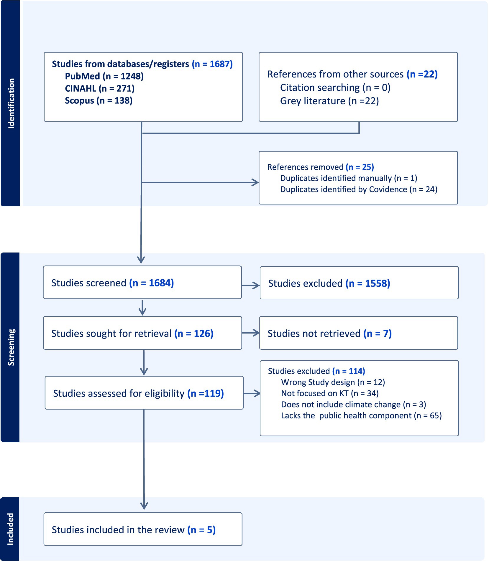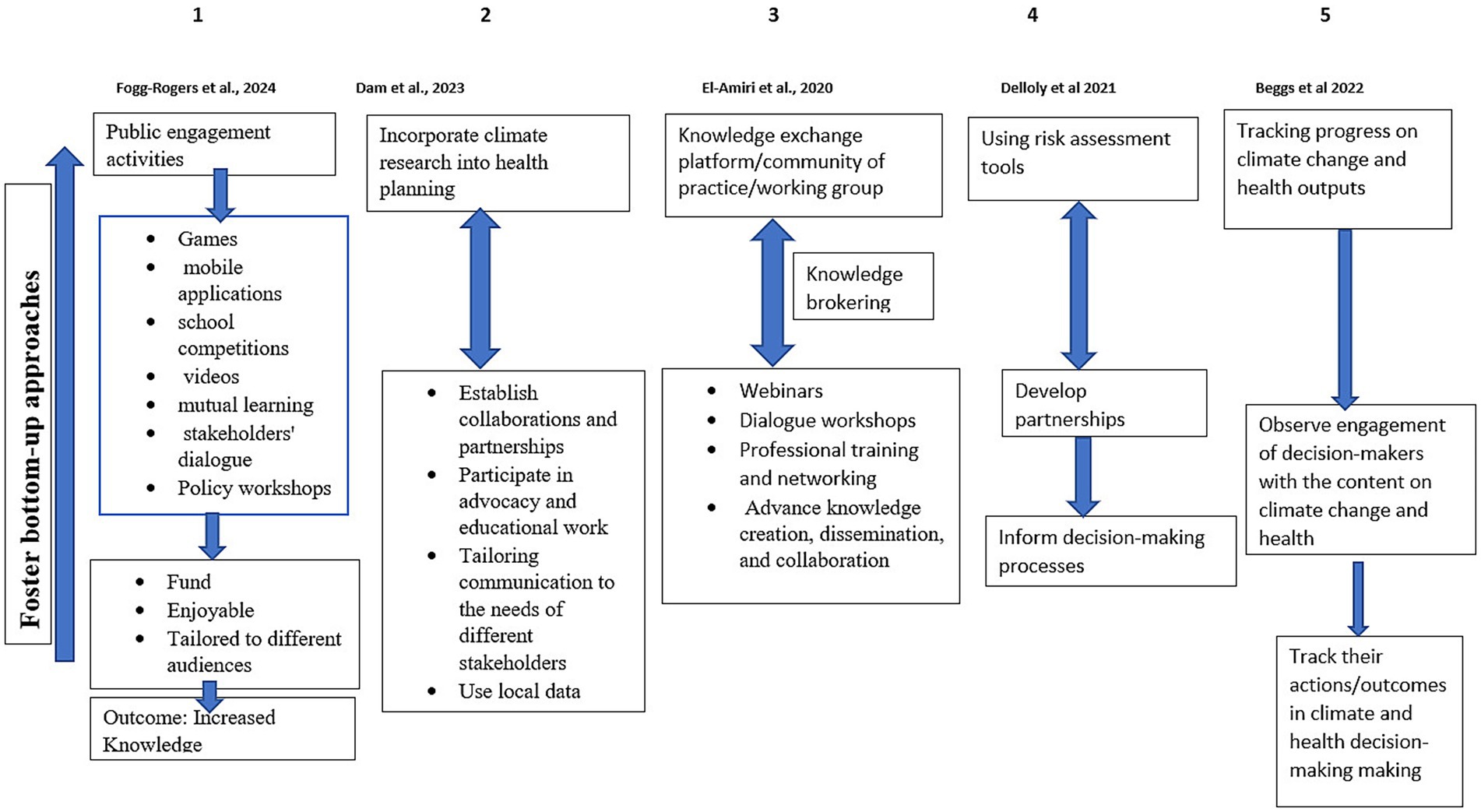 Five studies met the inclusion criteria and were included in the review, each exploring the three concepts of interest: knowledge translation, climate change, and health (Figure 1). In line with the review objective, we examined key knowledge translation strategies reported in the included studies including engagement activities shaping climate health decision-making.