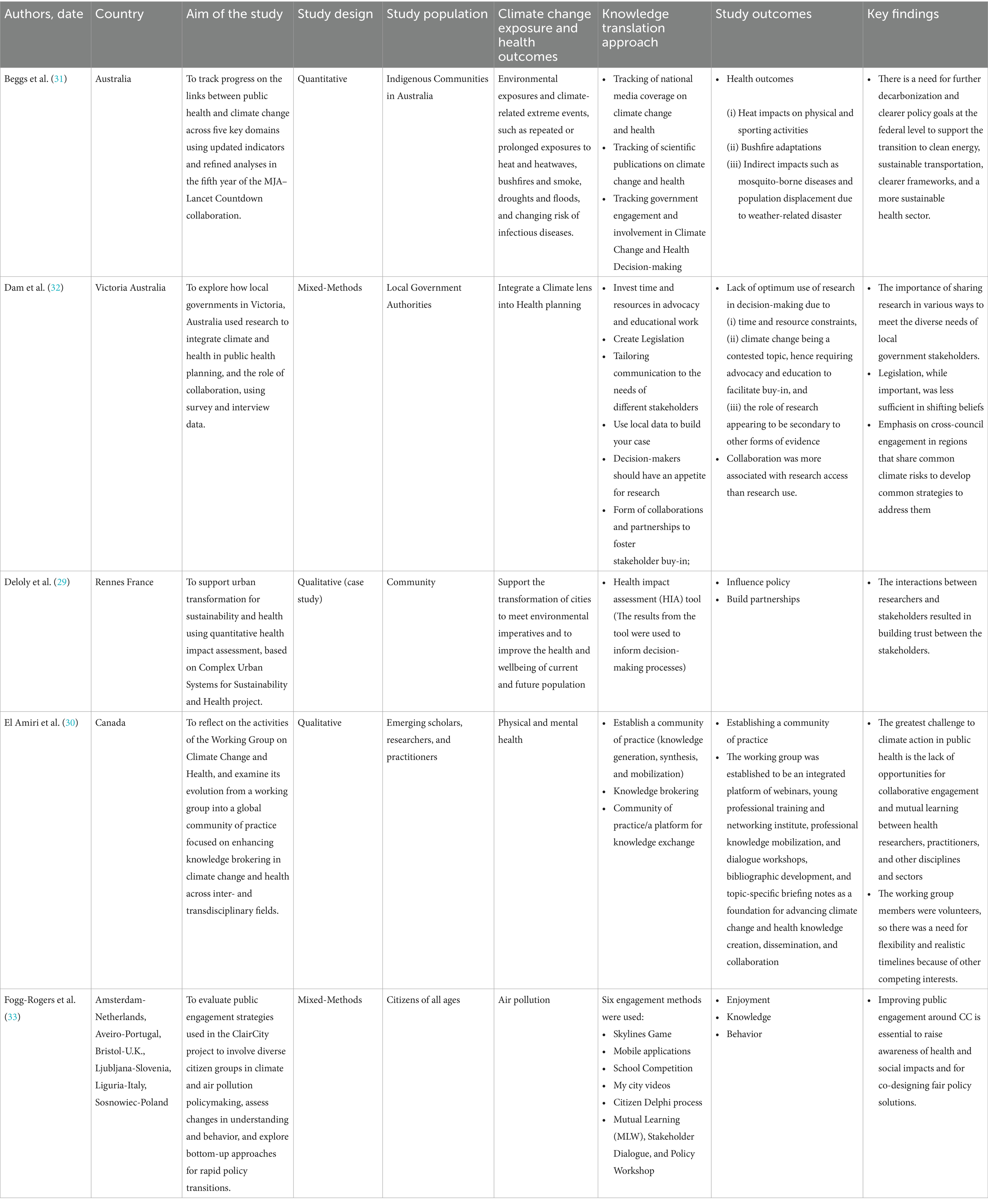 The studies represented diverse geographic contexts: two were conducted in Australia, one in France, one in Canada, and one was a multi-country study spanning the Netherlands, Portugal, the United Kingdom, Slovenia, Italy, and Poland. Methodological approaches varied, with two employing qualitative methods (29, 30), one using a quantitative design (31), and two adopting mixed-methods designs (32, 33). Although the search strategy covered publications from 2003 to 2024, all included studies were published between 2020 and 2024, reflecting a recent focus on translating climate change and health research into policy and practice (Table 1).
