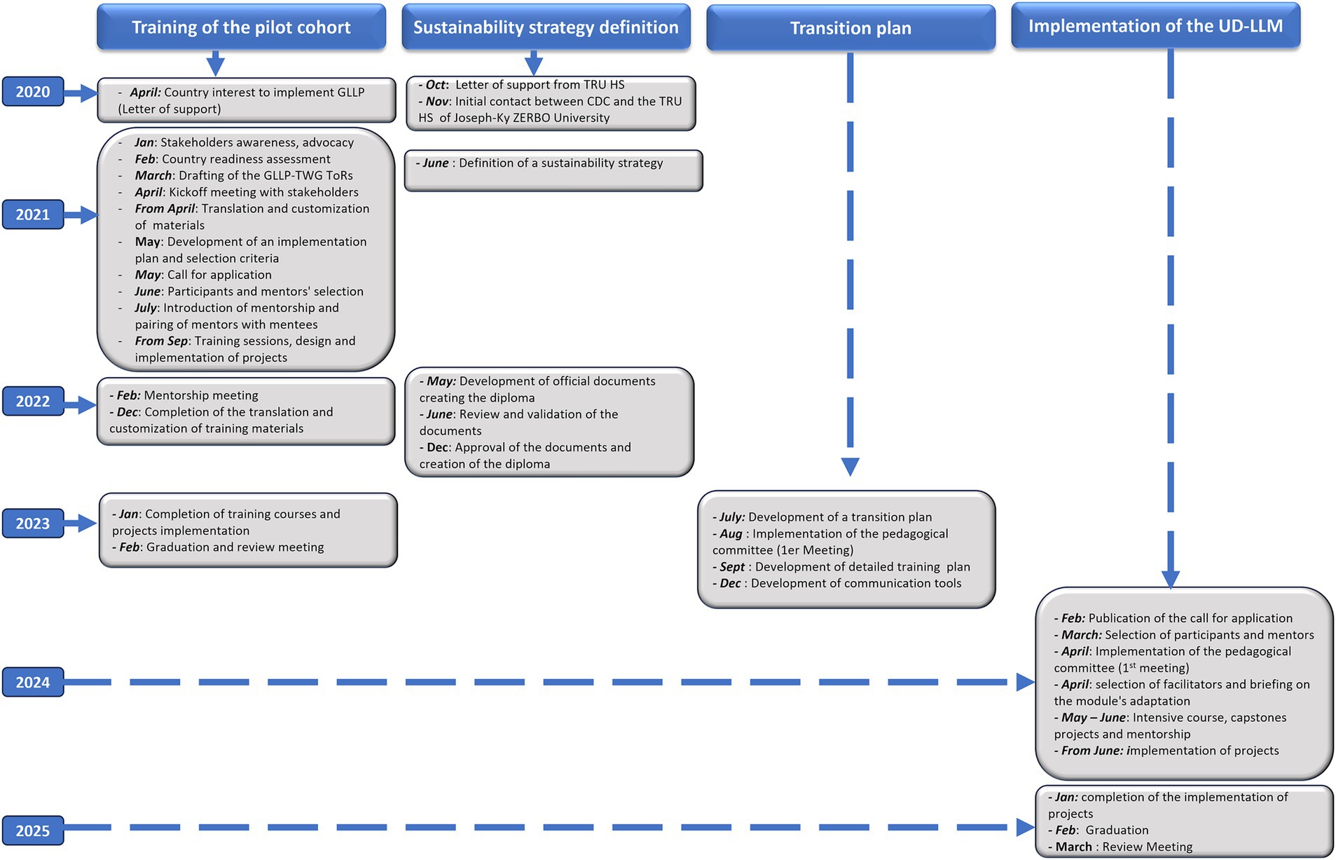 The training duration is nine months, consisting of five weeks of intensive didactic training, during which the 43 modules covering the nine competencies of GLLP are taught by selected facilitators, followed by six months of project implementation. Before the launch of the UD-LLM, a transition plan incorporating the outcomes from the review meeting was developed. This plan outlined the goals and objectives, desired outcomes, and measurable indicators. It also defined the roles and responsibilities of key stakeholders involved in the transition phase, identified the major steps to be taken, and specified the resources required, including both financial and human resources. An 8-month planning phase occurred from the development of this plan to the publication of the call for applications. Figure 1 describes the entire process, which took about 10 months from the letter of interest to the creation of the diploma.