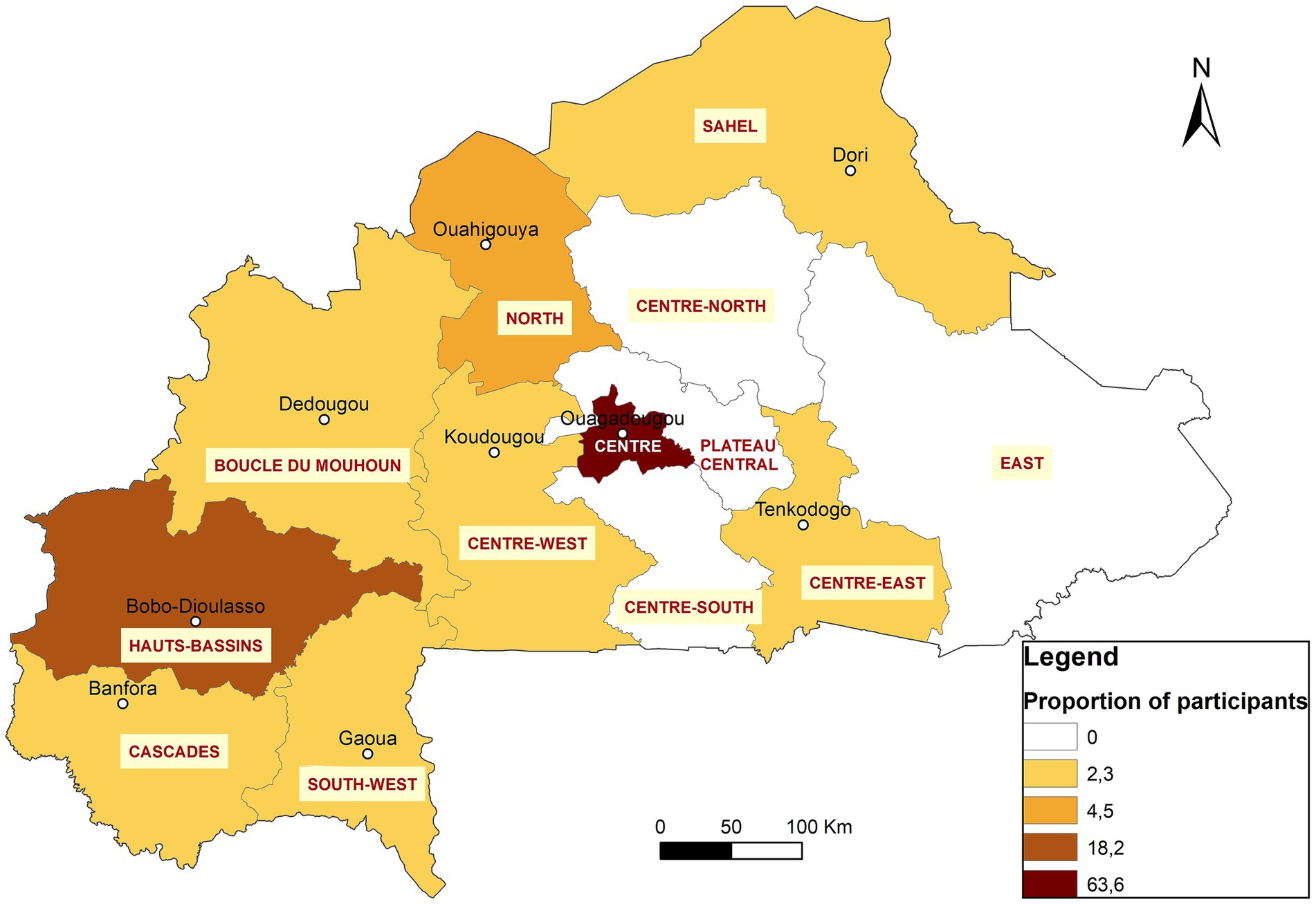 After the selection process, 18 participants were enrolled, from laboratories in 9 institutions across 4 regions of the country: Centre, Hauts-Bassins, South-West, and Cascades (Figure 2). The participants included 11 from human health, three from animal health, two from food, and two from environmental sectors. They were paired with nine mentors from the same areas to support them in designing and implementing their projects. Table 1 provides an overview of the participants’ repartition and a list of their affiliated structures.