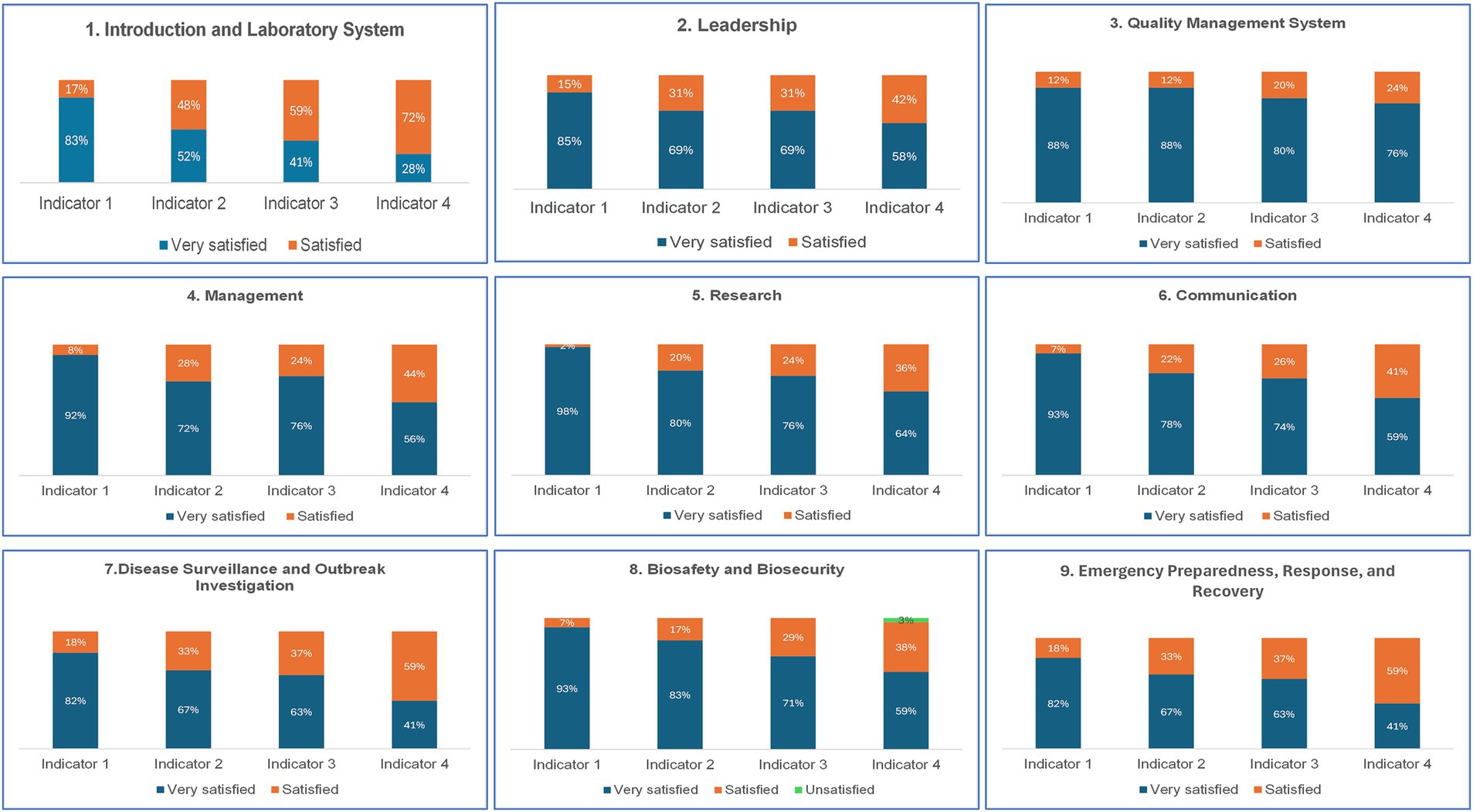 The evaluation scores by indicators and competencies, as illustrated in Figure 3, revealed that overall, participants were very satisfied (68.58%) or satisfied (25.78%) with the didactic course. However, regarding Biosafety/Biosecurity competency, 3% of participants were unsatisfied.