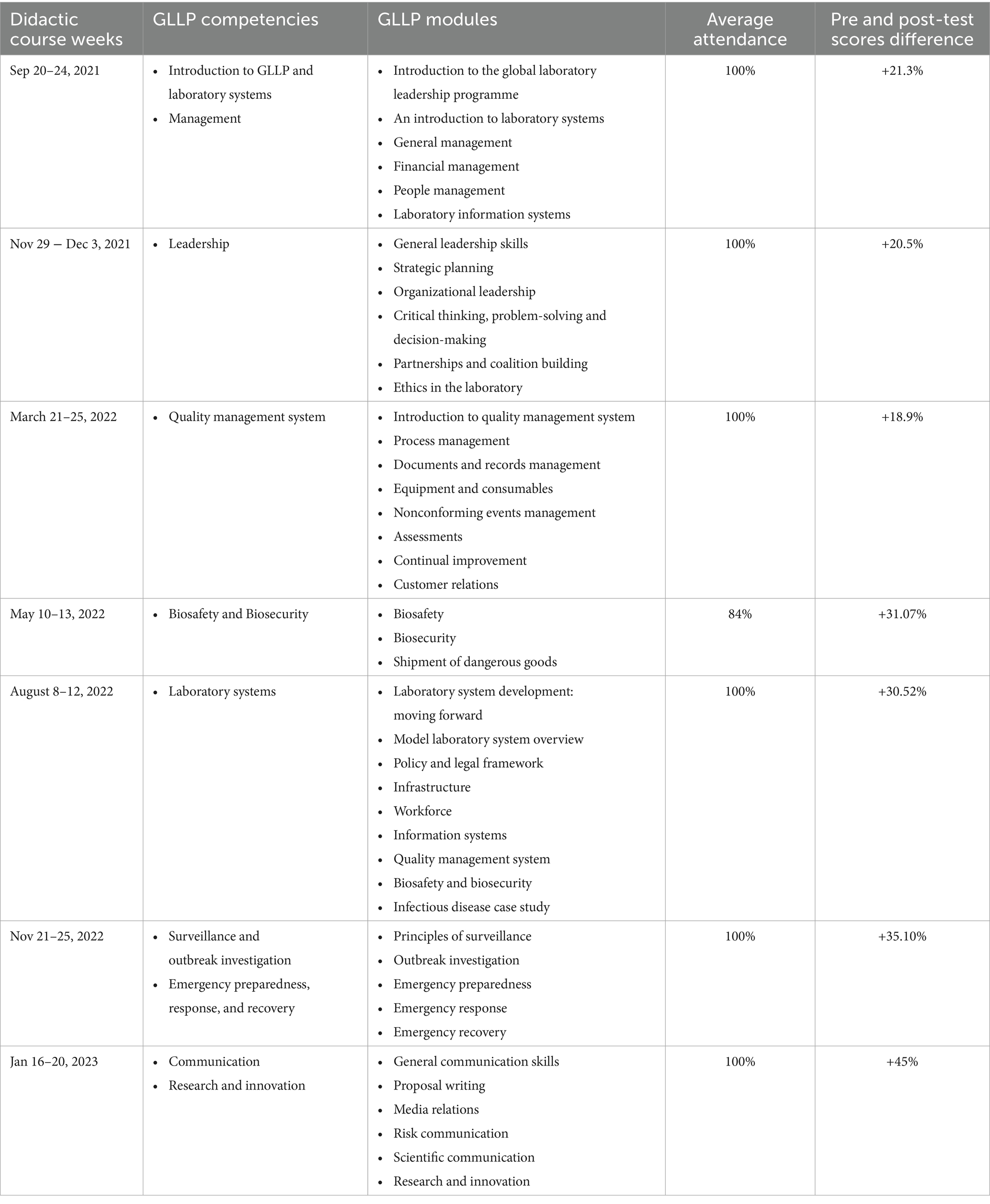 To address the gap in specialized training for current and emerging laboratory leaders in leadership and management, the World Health Organization (WHO), the Food and Agriculture Organization of the United Nations (FAO), the World Organization for Animal Health (WOAH), the European Centre for Disease Prevention and Control (ECDC), the US Centers for Disease Control and Prevention (CDC), and the Association of Public Health Laboratories (APHL) partnered to develop the Global Laboratory Leadership Programme (GLLP) (4, 19). The framework of this program adopts the WHO’s definition of competency as “the state of proficiency of a person to perform the required practice activities to the defined standard” (20).