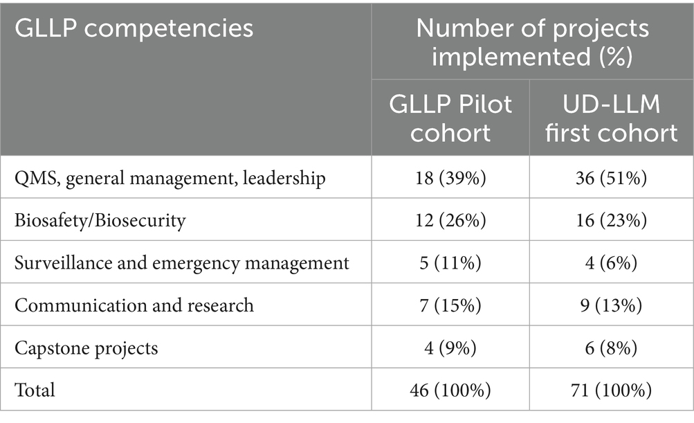 On average, each participant from the two cohorts implemented four projects during the training period, with at least one of them directly related to leadership or management. Although other projects did not explicitly focus on leadership and management competencies, the knowledge acquired from the training modules related to these competencies significantly contributed to their successful implementation. Most of these projects involved implementing changes and improvements to align with national or international guidance or requirements to address identified gaps. Therefore, their execution required strategic, knowledge-oriented, value-based, supportive, participatory, and communicative actions, which are part of leadership characteristics as defined by Friman (25). It is well documented that contemporary challenges driven by the rapid pace of change and innovation in the public health sector highlight the evolving role of leaders in health institutions, including laboratories. This situation justifies the critical need to equip these leaders with the skills and competencies necessary for swift adaptation and effective management of public health events (32).