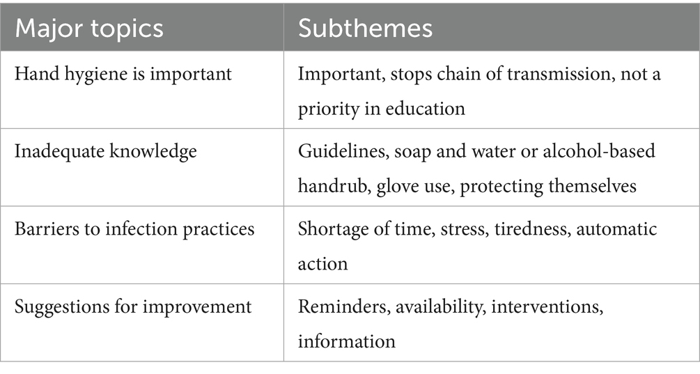 Results: Four major topics emerged from the analyses of the transcript data: hand hygiene is important, inadequate knowledge, barriers to infection practices, and suggestions for improvement.