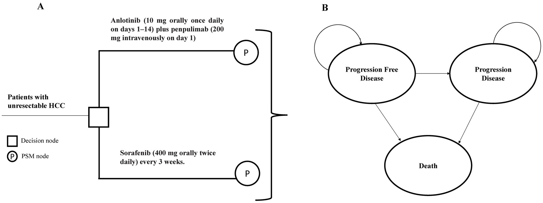 Figure 1. Model structure of the partitioned survival model with three health states. (A) Decision tree used to compare the standard first-line treatment for patients with HCC. (B) The PSM model simulated three health states: progression-free survival, progressive disease, and death. HCC, hepatocellular carcinoma; PSM, partitioned survival model.