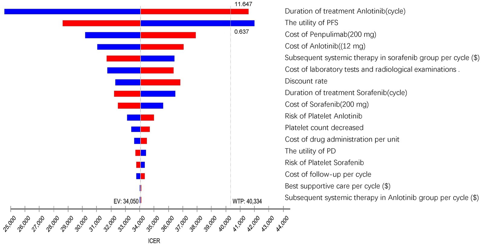Figure 2. The tornado diagram summarizes the result of the one-way sensitivity analysis. QALY, quality-adjusted life year; GDP, gross domestic product; ICER, incremental cost-effectiveness ratios; WTP, willingness to pay; EV, expected value; PFS, progression-free survival; PD, progressive disease.