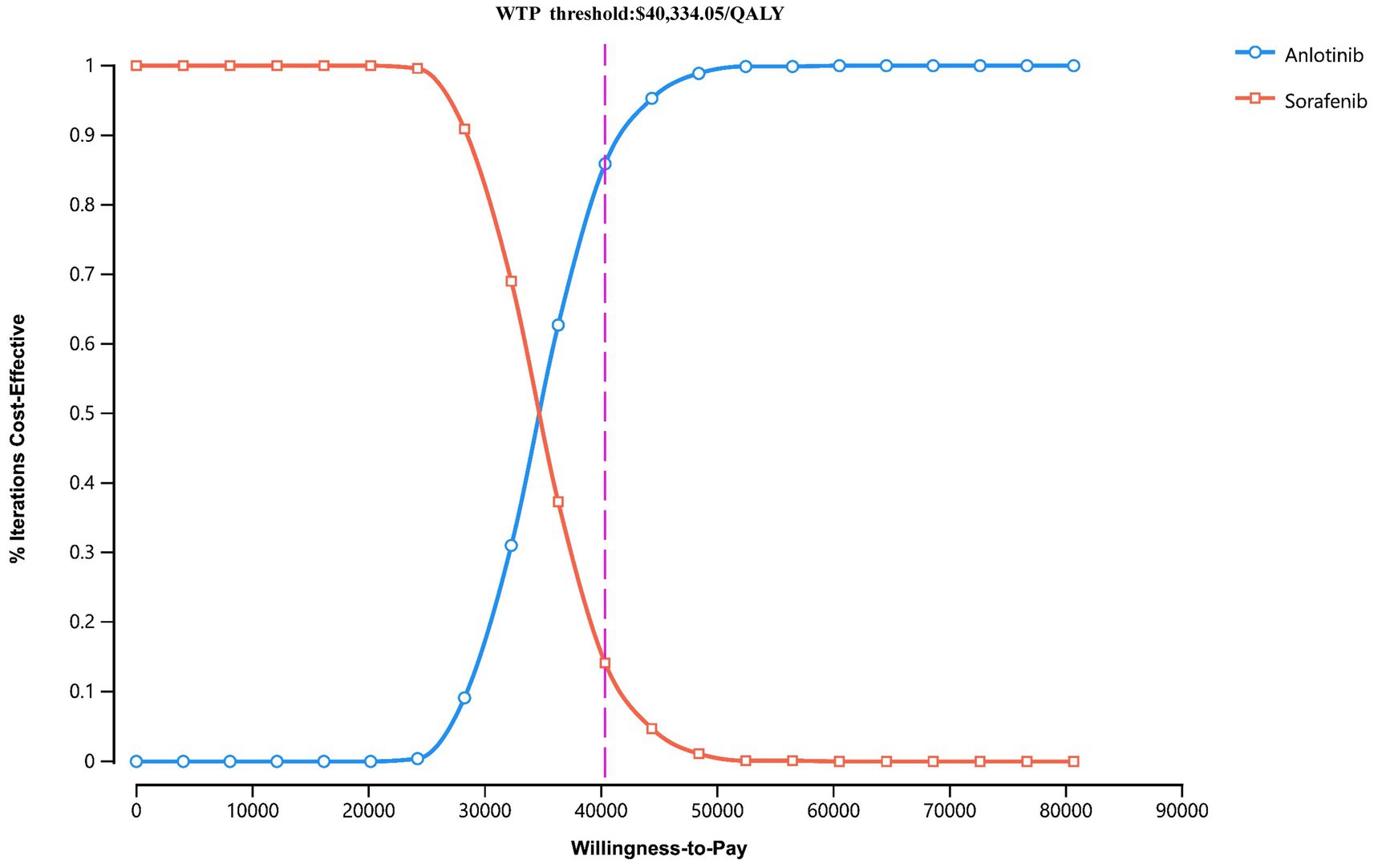 Figure 3. Cost-effectiveness acceptability curves for anlotinib plus penpulimab vs. sorafenib. The purple dashed lines indicate the willingness-to-pay threshold. WTP, willingness-to-pay.