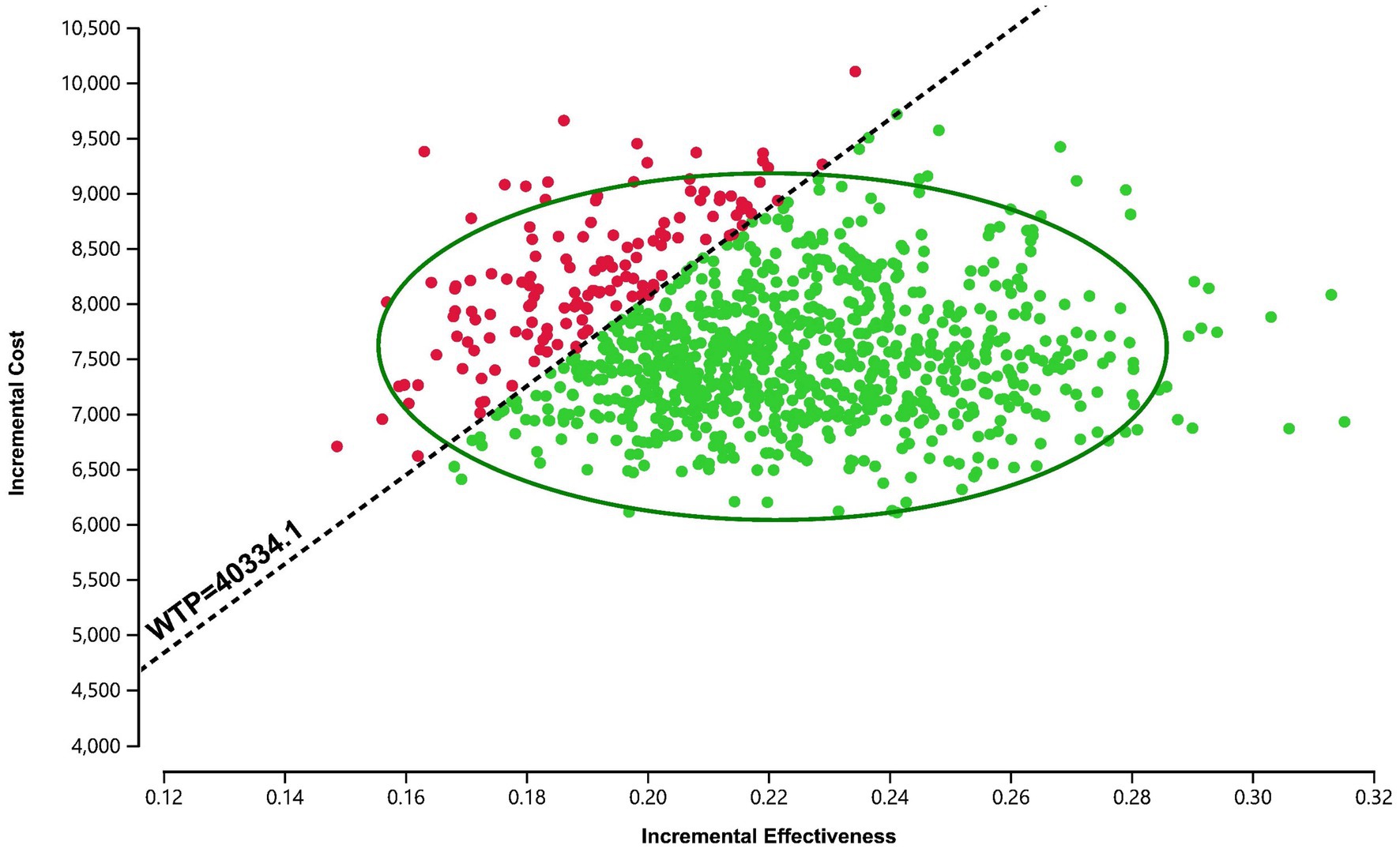 Figure 4. Scatter plot of the probabilistic sensitivity analysis for anlotinib plus penpulimab vs. sorafenib. The black dashed lines indicate the willingness-to-pay (WTP) threshold.