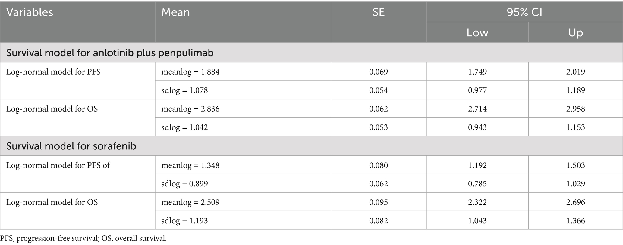 A partitioned survival model (PSM) was developed using TreeAge Pro 2022 (TreeAge, Williamstown, MA, United States) to assess the cost-effectiveness of anlotinib plus penpulimab compared with sorafenib in advanced HCC (Figure 1). The PSM approach was selected because it allows direct extrapolation of the Kaplan–Meier curves for OS and PFS from the APOLLO trial. This finding offers a major advantage by accurately reflecting observed patient outcomes without requiring assumptions regarding transition probabilities between health states—a necessity in Markov models. Given that the treatment benefit of anlotinib plus penpulimab is characterized by concurrent improvements in both PFS and OS, the PSM provides a more direct and less assumption-dependent representation of this combined treatment effect.