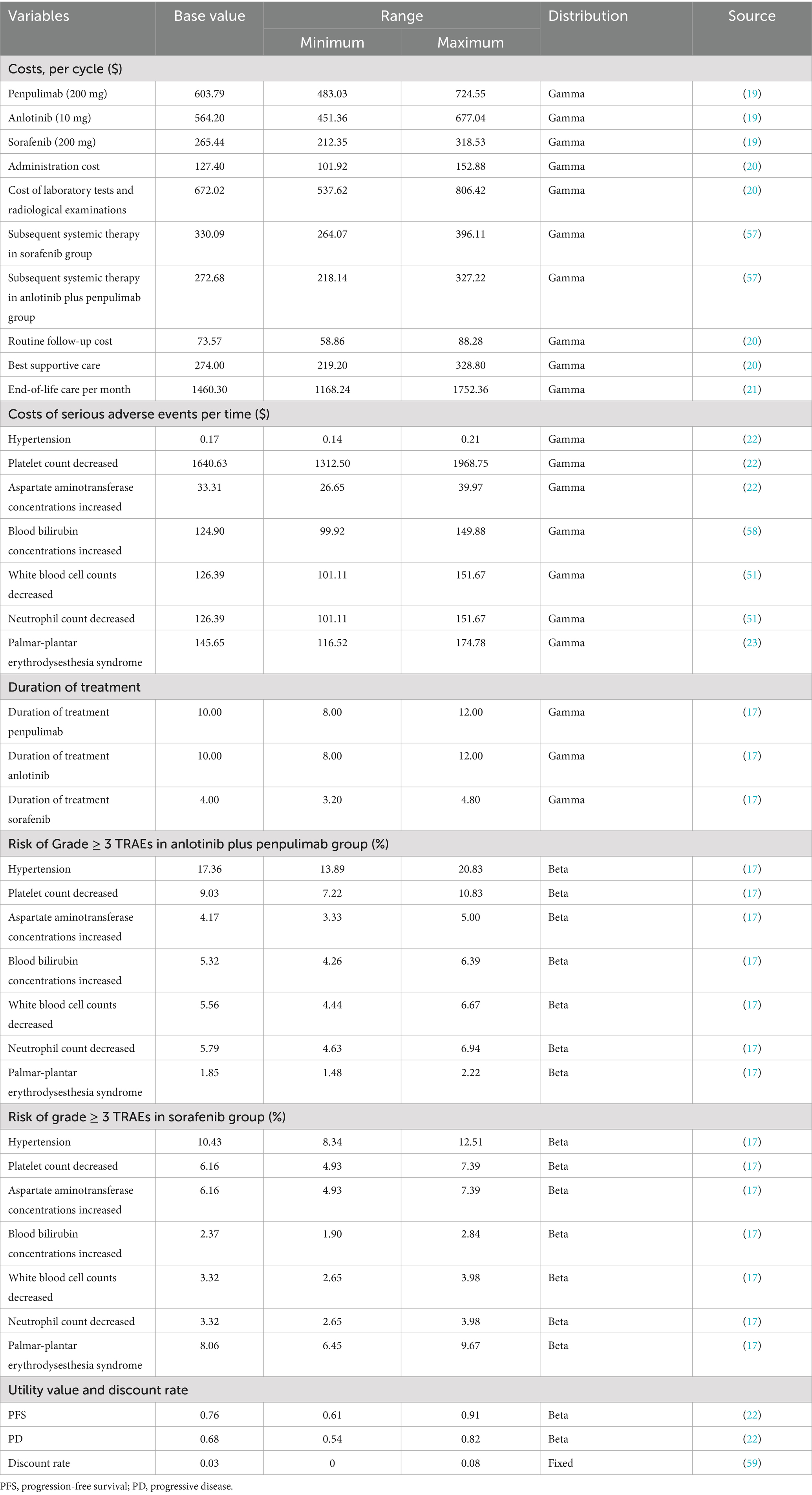 For adverse events, grade ≥3 AEs with ≥5% incidence in the APOLLO trial were included, such as increased AST levels, decreased white blood cell count, decreased neutrophil count, bilirubin elevation, decreased platelet count, palmar-plantar erythrodysesthesia syndrome, and hypertension. Treatment-related grade ≥3 AEs from the APOLLO trial are listed in Supplementary Table S4. The risk of TRAEs in both treatment groups is shown in Table 2, with AE management costs and subsequent systemic therapy costs referenced from the literature (21–23). The subsequent treatments for patients in the PD state were aligned with those used in the APOLLO trial. The best supportive care was applied continuously from the point at which a patient exited active anti-cancer therapy (either after progression or upon discontinuation for toxicity) until death. End-of-life costs were calculated for patients in their final month of life. All costs were adjusted and presented in 2024 USD (1 USD = 7.1217 RMB) and adjusted for inflation using the annual Consumer Price Index for healthcare published by the National Bureau of Statistics of China (CPI = 100.6 for 2022, 101.1 for 2023, and 101.3 for 2024) (24, 25).